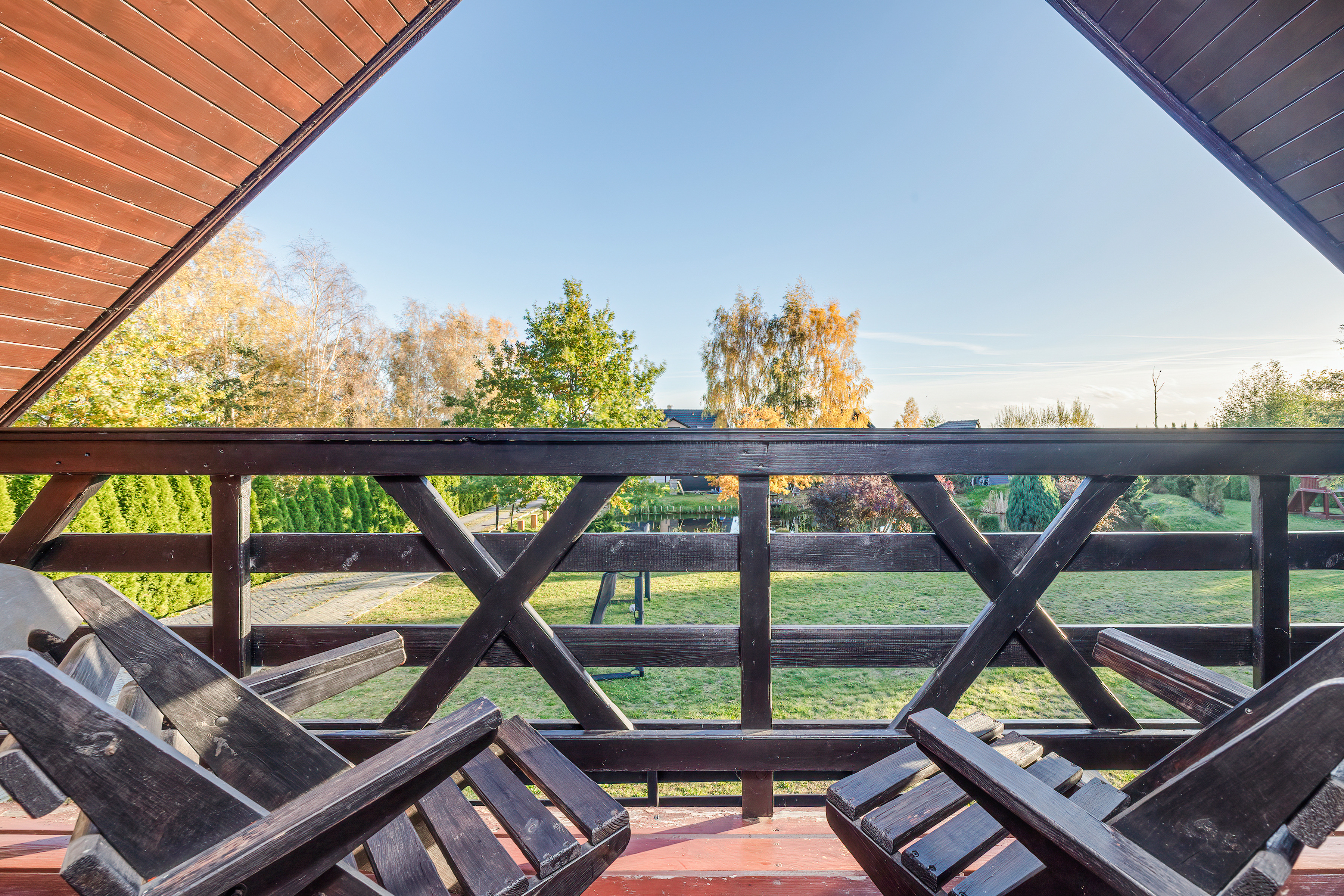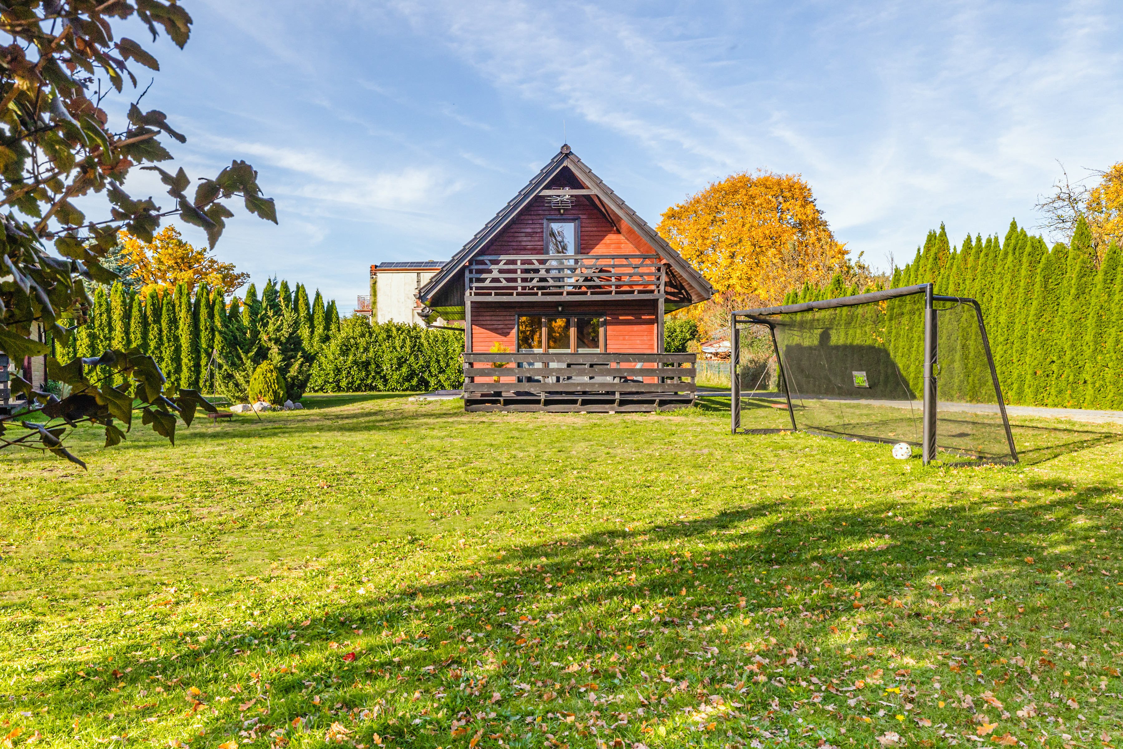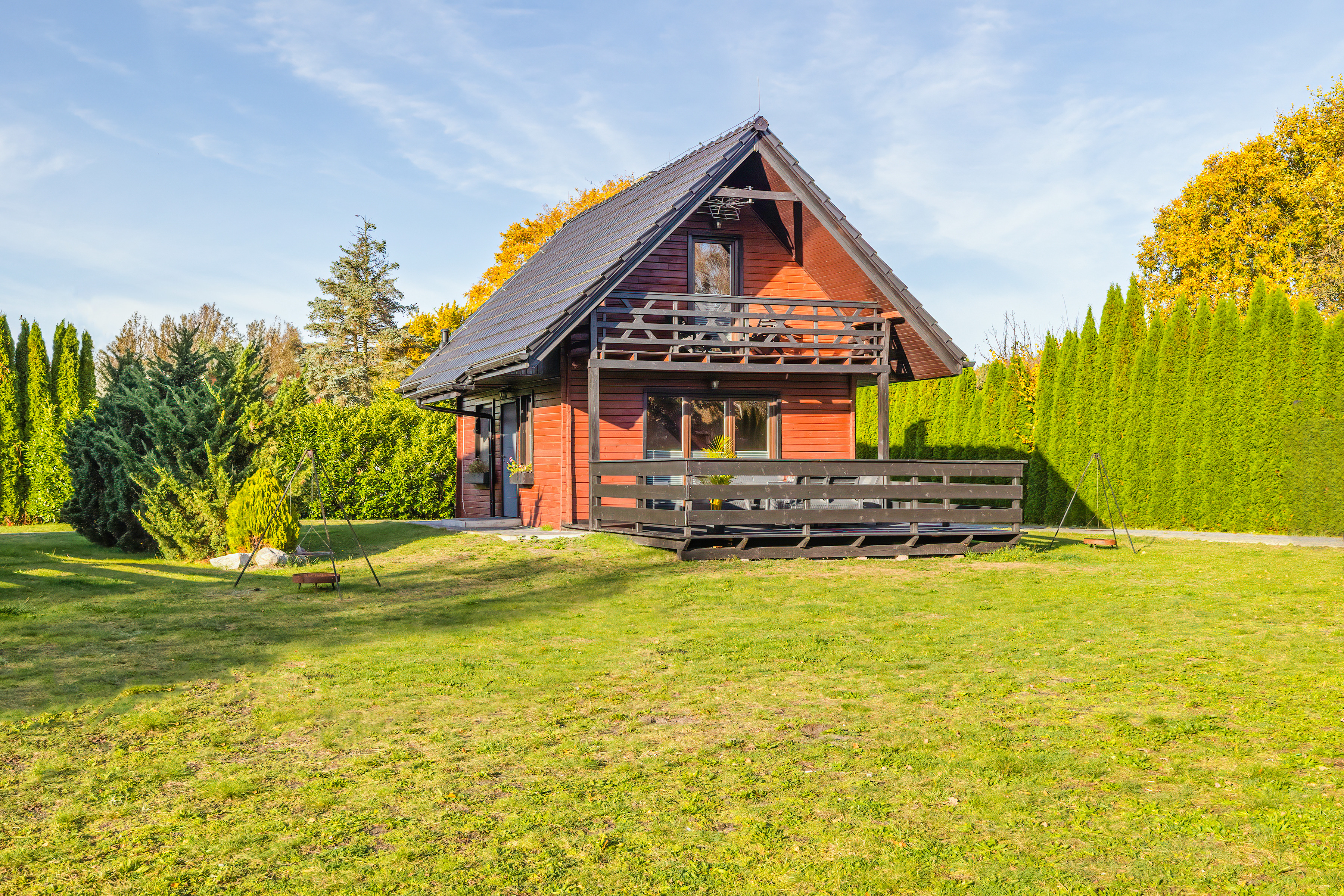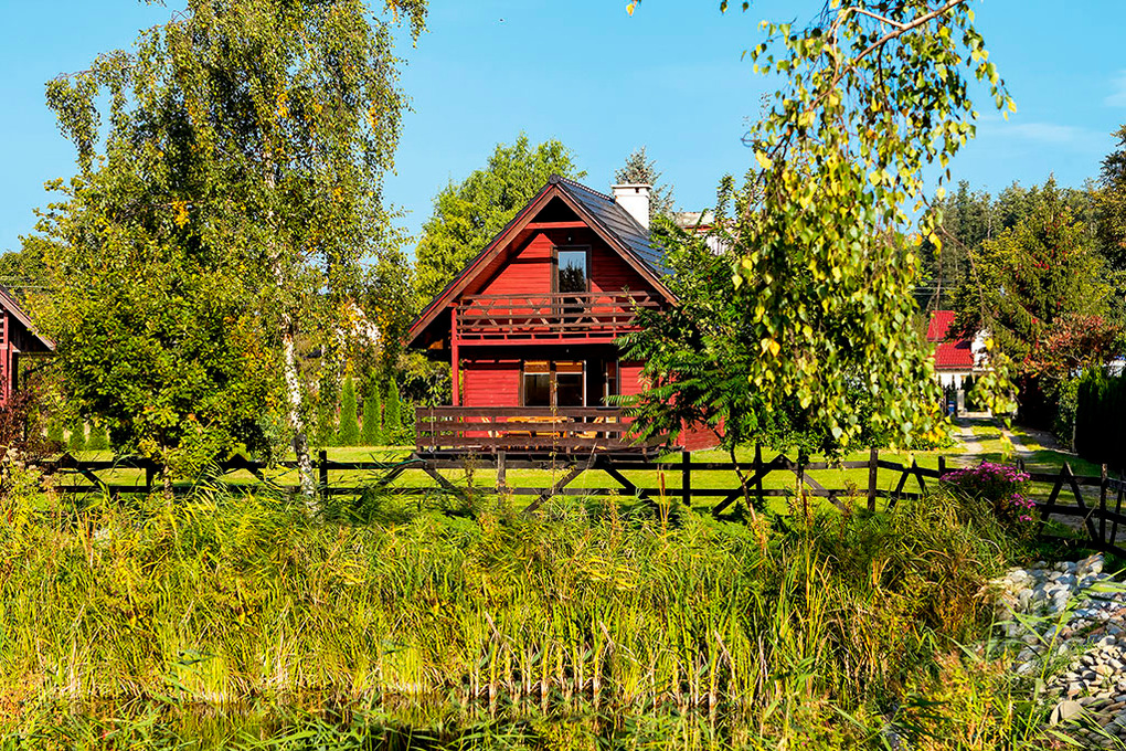 PL 11.80 Ferienhaus 2-6 Pers.: Schönes 3-Zimmerhaus mit 54 qm Wohnfläche über 2 Etagen. Parterre: Wohn-/Essraum mit Sofa (Ausziehcouch 2 Pers.), Sat-TV (dt. Programme), Internet (WLAN) Esstisch, Küchenzeile (2 E-Platten). Bad/WC. Dachgeschoss: Doppelzimmer mit Balkon. 2-Bettzimmer, offen zur Treppe. Separates WC. Große Terrasse mit Sitzmöbeln und idyllischem Blick auf den Gartenteich.