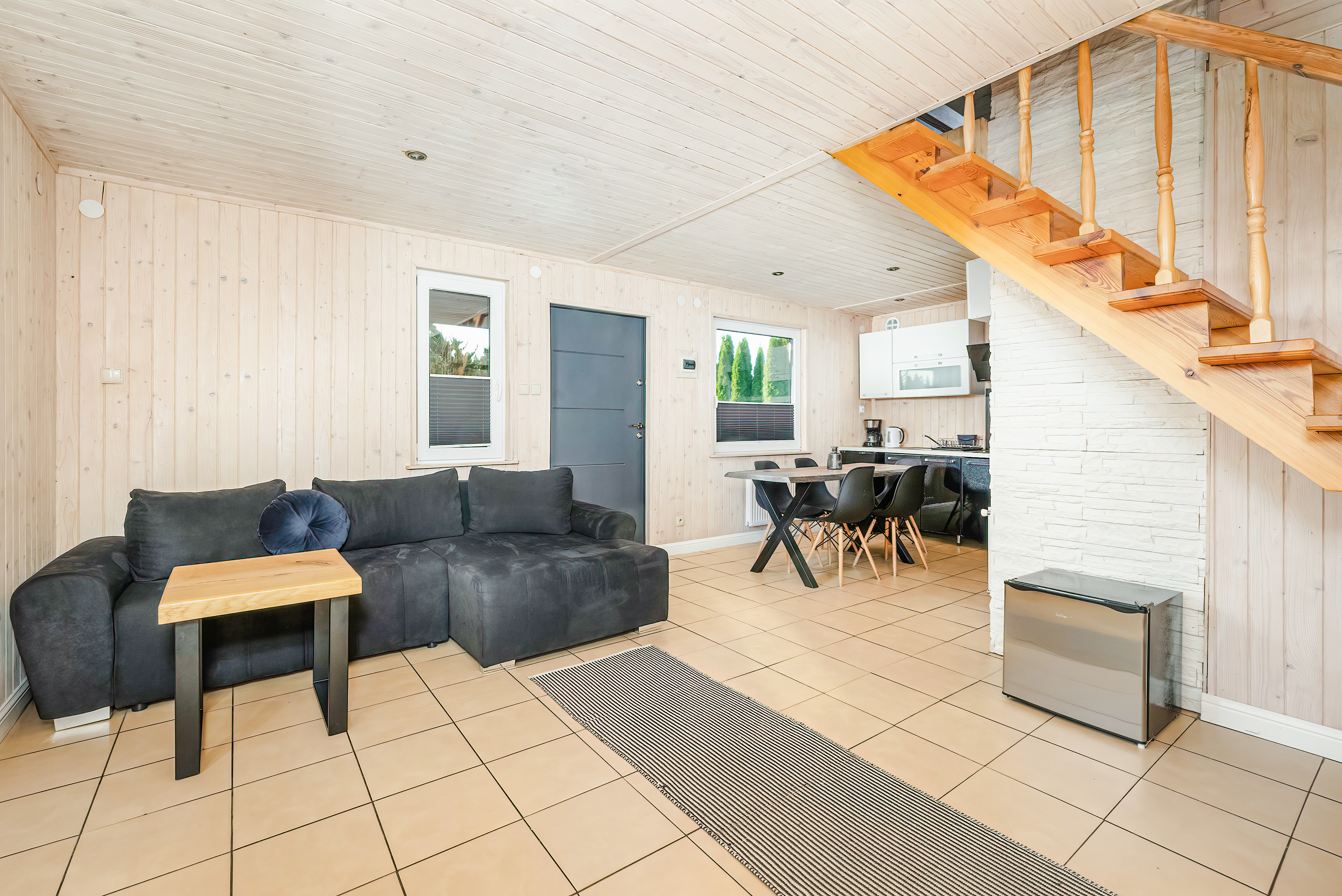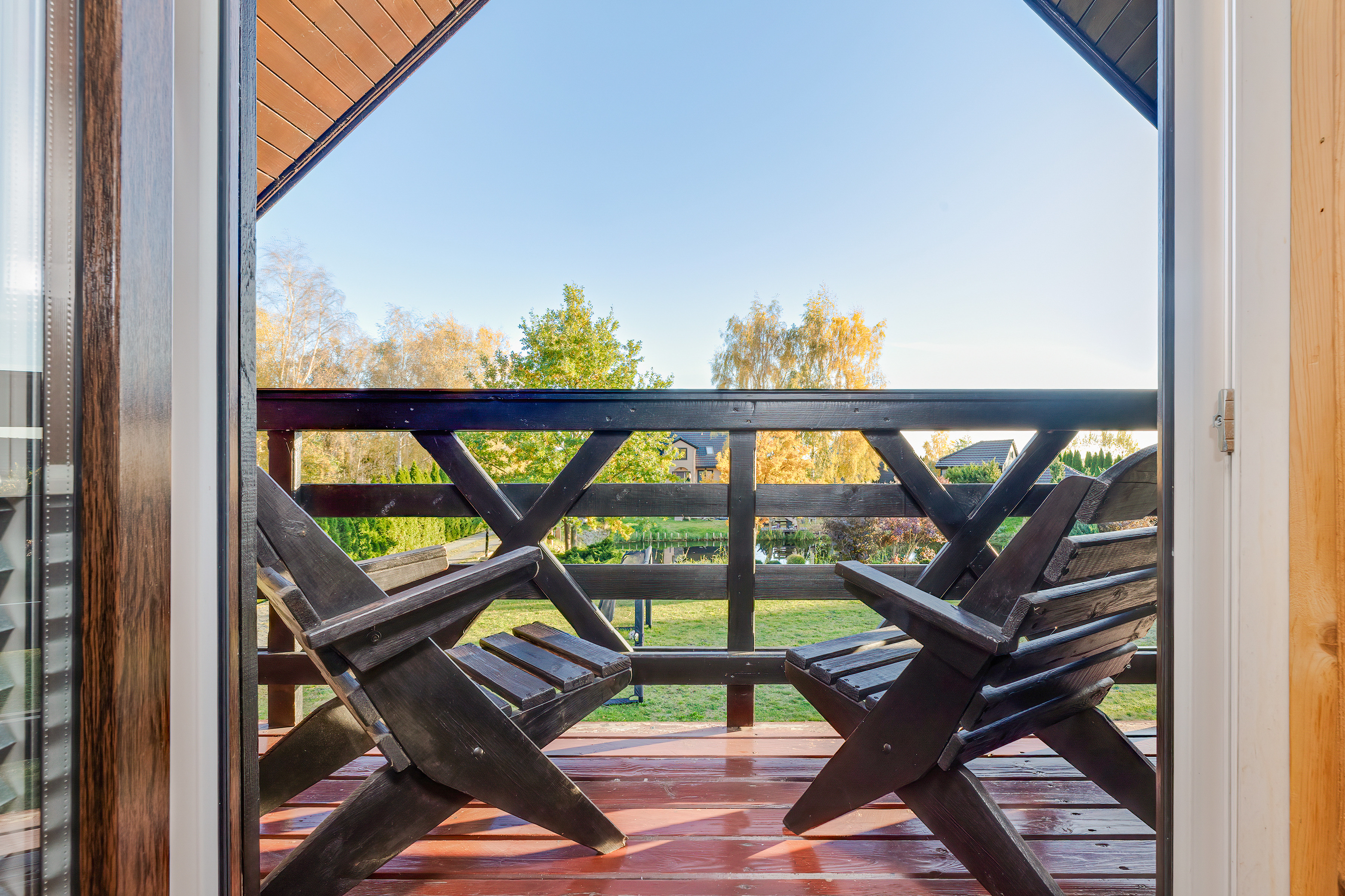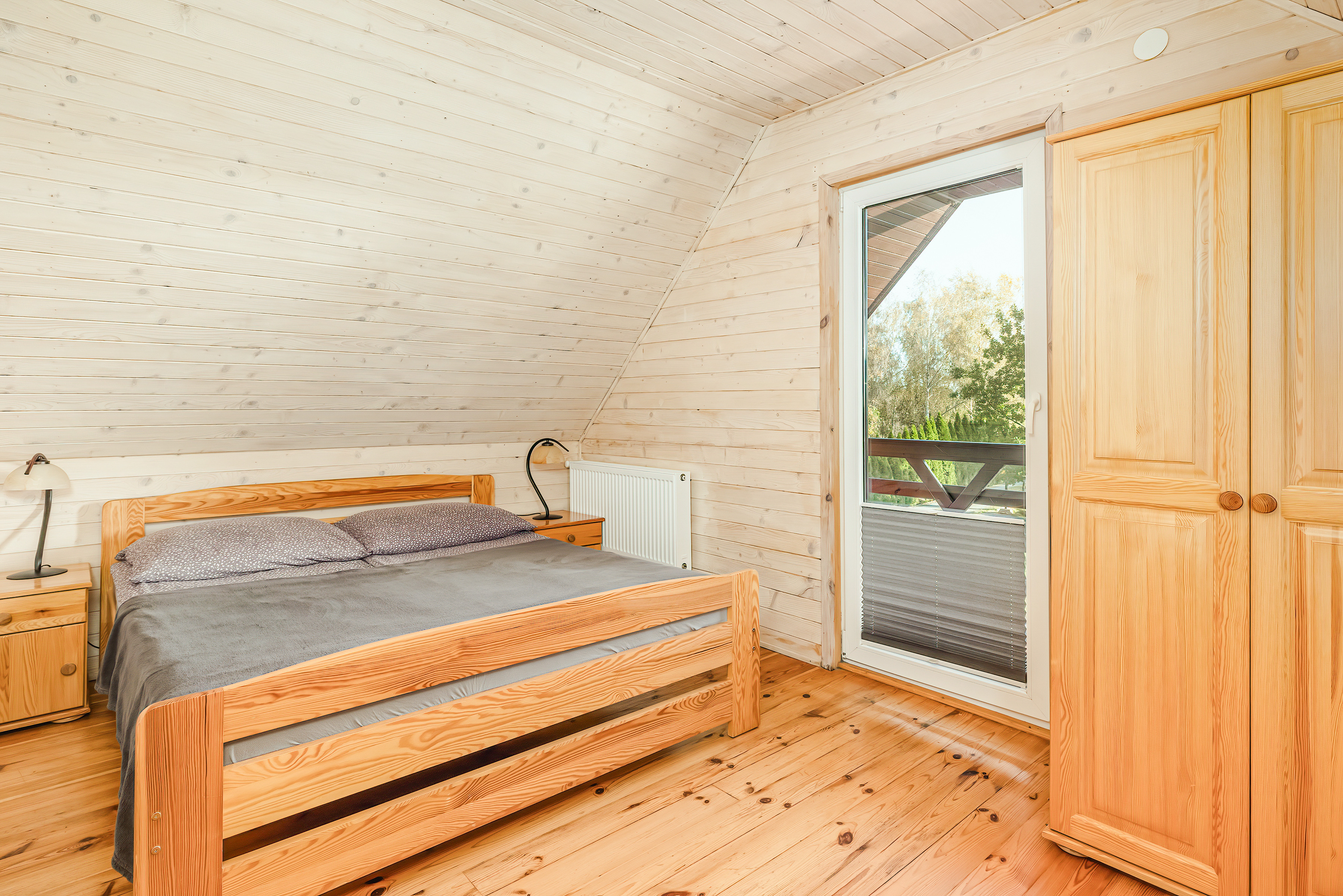 PL 11.80 Ferienhaus 2-6 Pers.: Schönes 3-Zimmerhaus mit 54 qm Wohnfläche über 2 Etagen. Parterre: Wohn-/Essraum mit Sofa (Ausziehcouch 2 Pers.), Sat-TV (dt. Programme), Internet (WLAN) Esstisch, Küchenzeile (2 E-Platten). Bad/WC. Dachgeschoss: Doppelzimmer mit Balkon. 2-Bettzimmer, offen zur Treppe. Separates WC. Große Terrasse mit Sitzmöbeln und idyllischem Blick auf den Gartenteich.