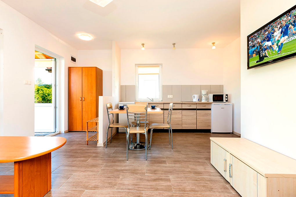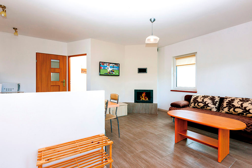 PL 38.75 Ferienhaus 2-4 Pers.: 2-Zimmerhaus mit 35 qm Wohnfläche. Wohn-/Essraum mit Kamin, Sofa (Schlafcouch 2 Pers.), Sat-TV mit deutschen Programmen, Esstisch, Küchenzeile (Ceranfeld 2 Pl., Mikrowelle, Spülmaschine). Doppelzimmer. Bad/WC. Überdachte Terrasse mit Sitzmöbeln, Grill und anschließender Rasenfläche.