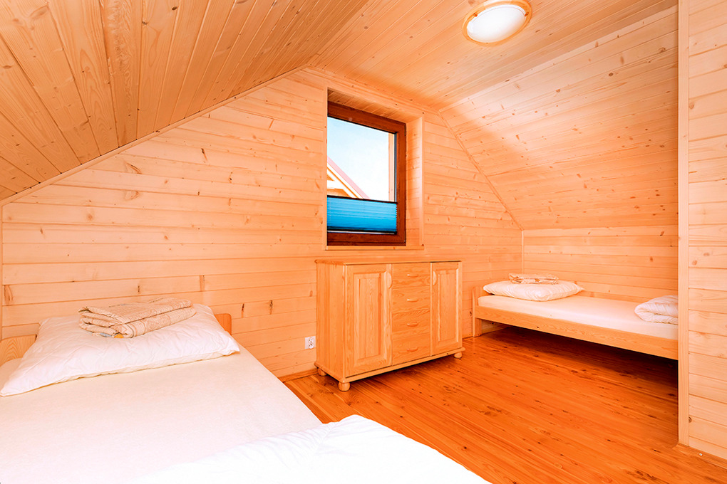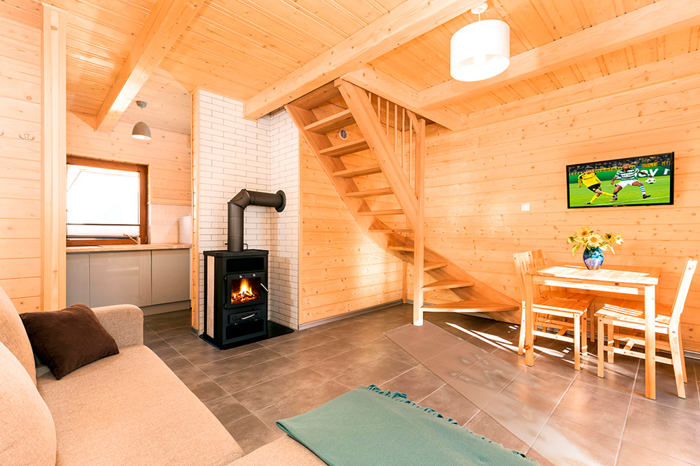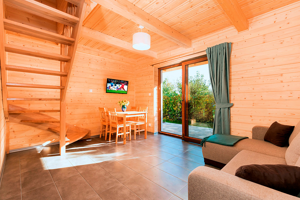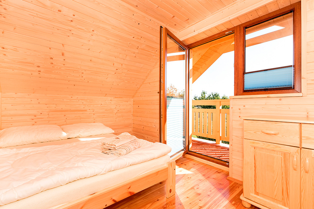 PL 43.9 Ferienhaus 2-7 Pers.: Schönes 3-Zimmerhaus mit 58 qm Wohnfläche über 2 Etagen. Parterre: Wohn-/Essraum mit rustikaler Holzbalkendecke, Kaminofen, Eckcouch (Ausziehcouch 2 Pers.), Sat-TV mit dt Programmen, Internet (W-Lan), Esstisch, moderner Küchenzeile (4 E-Pl. Ceranfeld, Mikrowelle, Tiefkühlschrank 33 l, Spülmaschine). Bad: Du, Wb, WC, Waschmaschine. Vom Wohnraum Holztreppe ins holzvertäfelte Dachgeschoss: 3-Bettzimmer mit franz. Bett, Einzelbett, Balkon. 2-Bettzimmer. Überdachte Terrasse mit Sitzmöbeln, Grill.