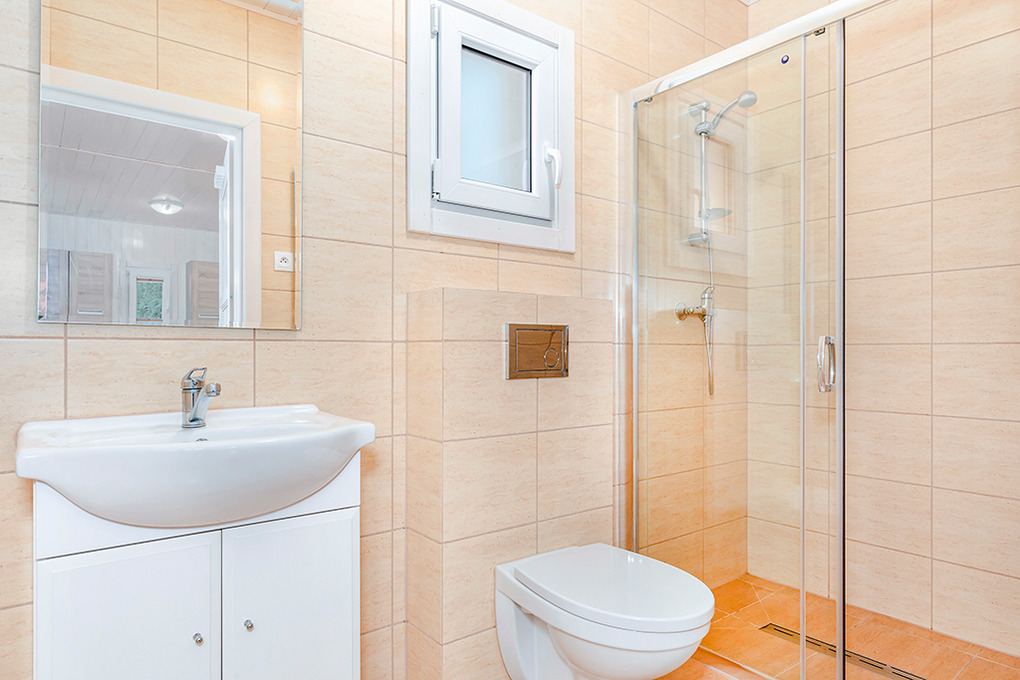 Ferienhäuser mit moderner Einrichtung aus hellen Kiefernholzmöbeln, 2019 neu erbaut. E-Heizung, Warmwasser über E- Boiler (80 l). Überdachte Terrasse. 1 Parkplatz pro Ferienhaus (Gebühr, bewacht nur Juli, August). Internet über WLAN nur im Rezeptionsbereich.