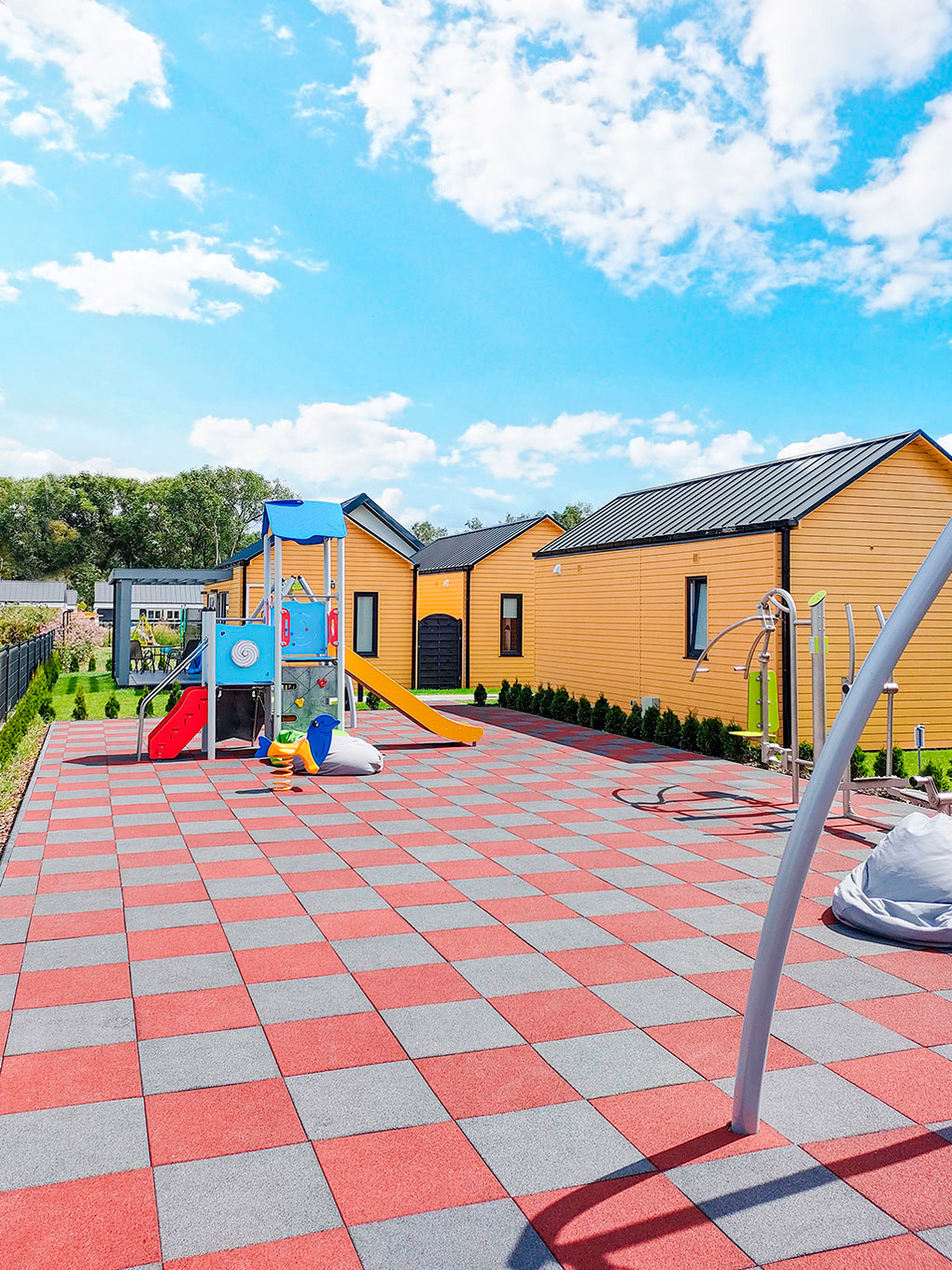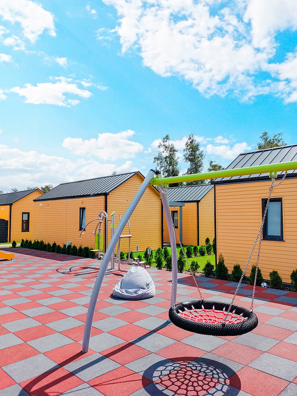 Haus: Schöne Ferienhausanlage auf einem 2800 m² großen, gepflegtem Rasengrundstück. In der Anlage: Rezeption. Mit Fallschutzmatten ausgelegter Kinderspielplatz mit Schaukeln, Rutschen, Klettergerüst, Trimm-Dich-Pfad. Trampolin, kleiner Fußballplatz.
