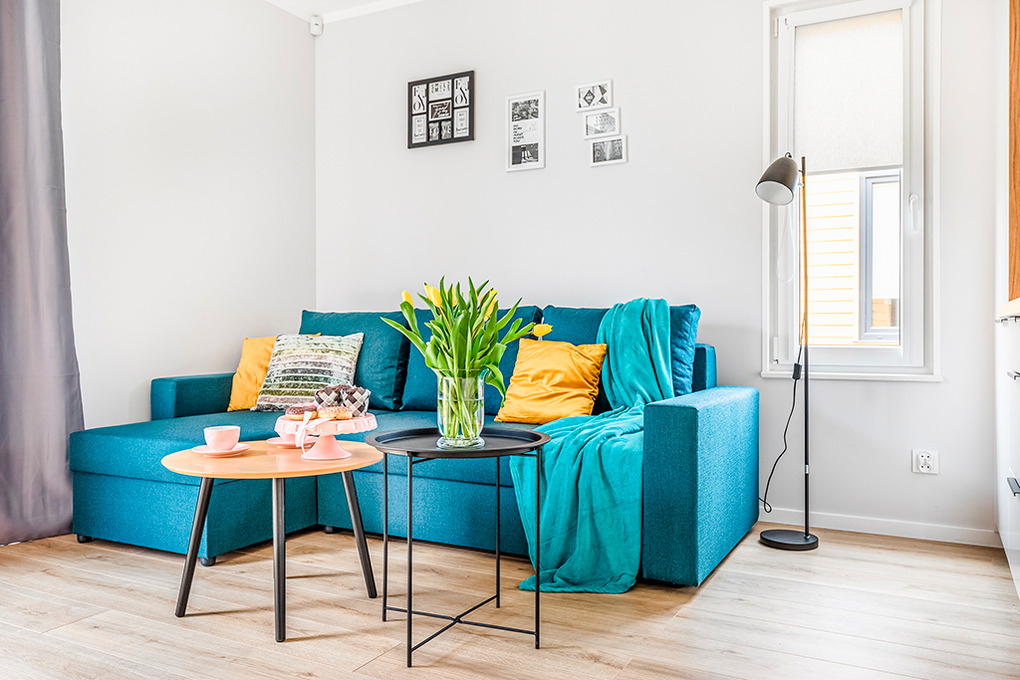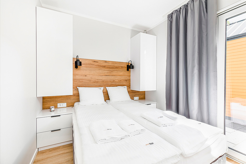 PL 37.14 Ferienhaus 2-4 Pers.: Stilvolles 2-Zimmerhaus mit 32 qm Wohnfläche. Wohnküche mit Esstisch, Eckcouch (Schlafcouch 2 Pers), DVBT-TV, Internet über WLAN, Küchenzeile (2 E-Platten, Abdunsthaube, Mikrowelle, Spülmaschine). Doppelzimmer. Bad/WC. Schöne Terrasse mit Sitzmöbeln.