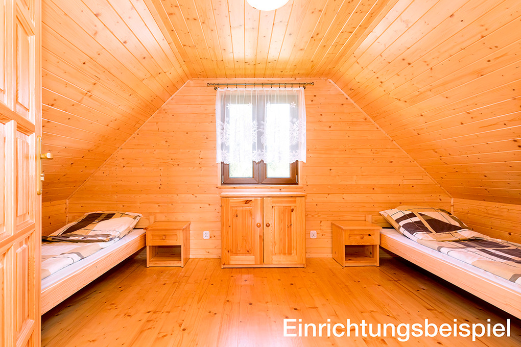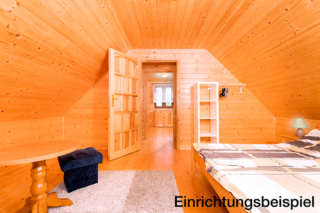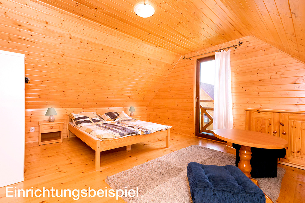 PL 44.5 Ferienhaus 2-8 Pers.: 3-Zimmerhaus mit 60 qm Wohnfläche über 2 Etagen. Parterre: Wohn-/Essraum mit Couchgarnitur (2 Schlafsofas für jeweils 2 Pers.), Sat TV mit deutschen Programmen, Internet (W-Lan), Esstisch, Küchenzeile (2 E-Platten). Bad/WC. Dachgeschoss: 2 Doppelzimmer. Schöne überdachte Holzterrasse mit Sitzmöbeln.