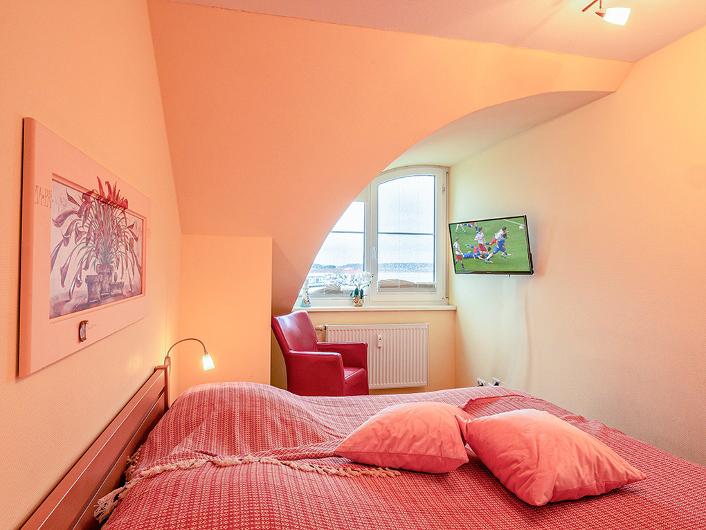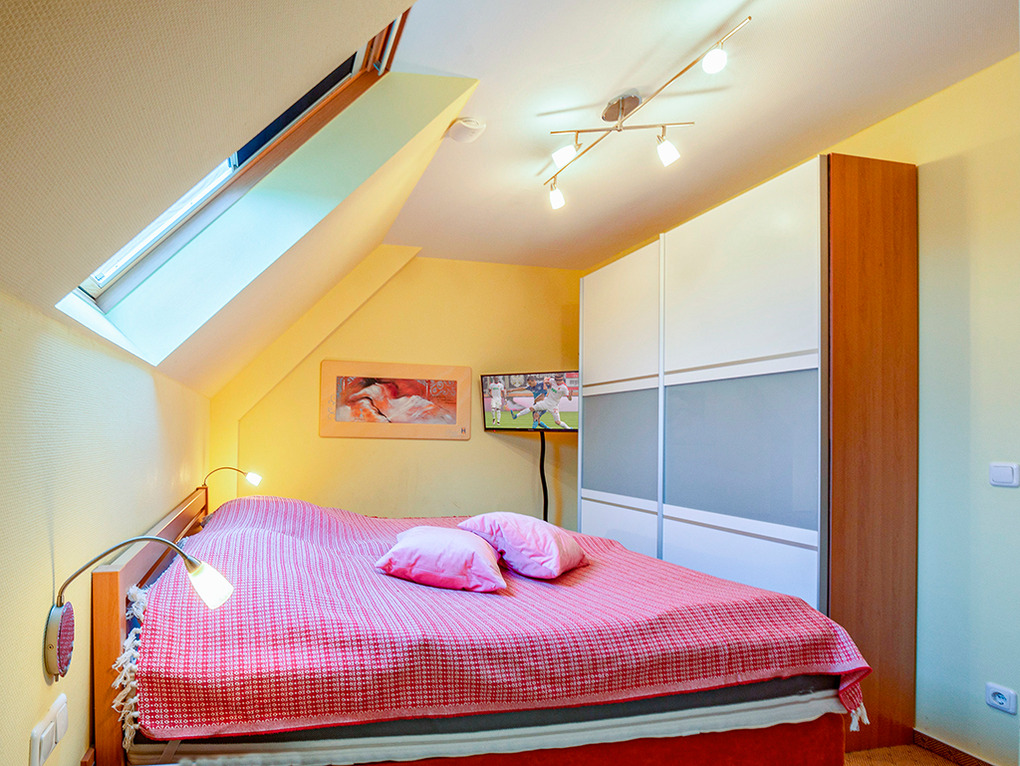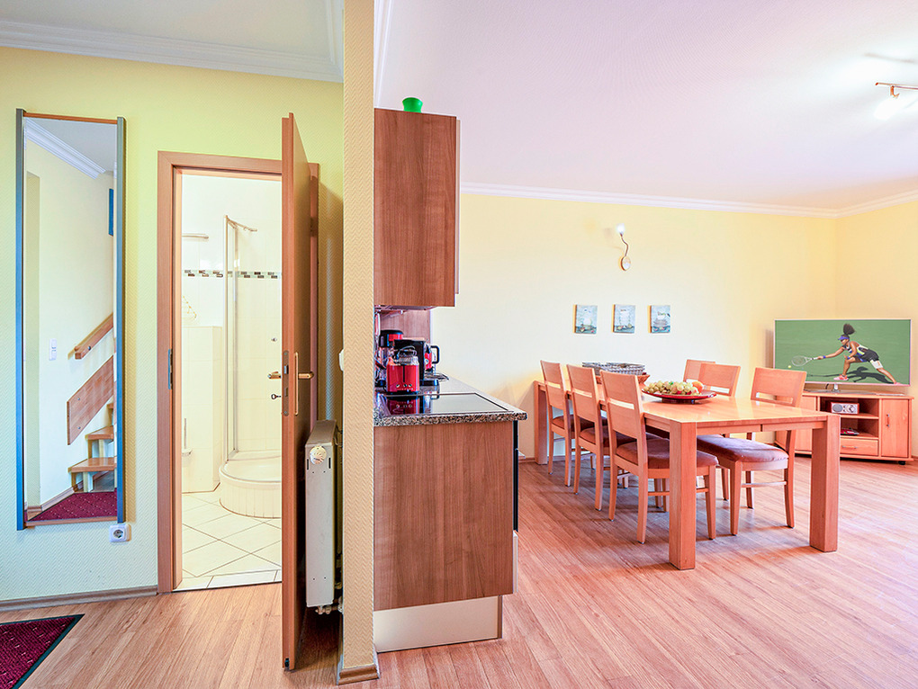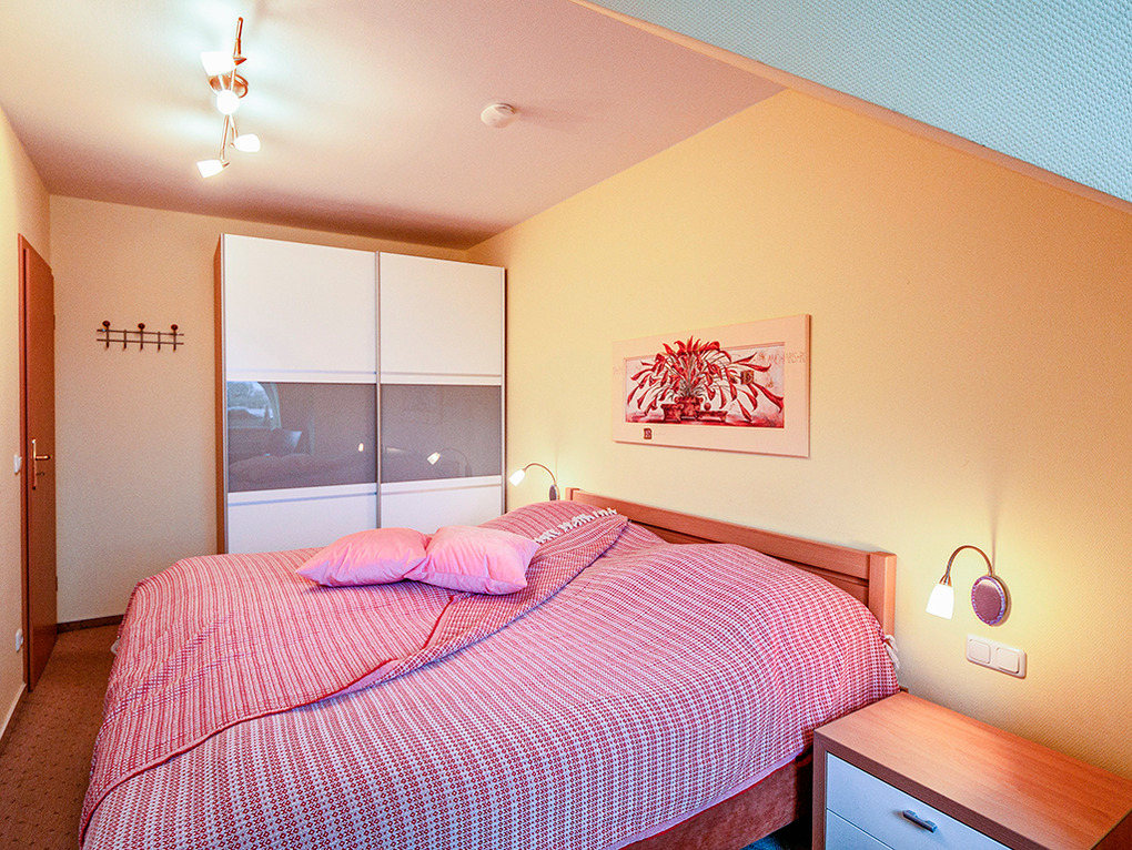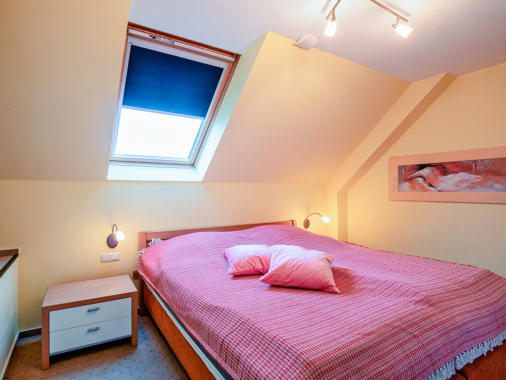 D 23.18 Wohnung 2-6 Pers.: 3-Zimmer-Maisonettewohnung mit 67 qm Wohnfläche über 2 Etagen. 1. Etage: Heller Wohn-/Essraum mit Sitzecke (Schlafsofa 2 Pers.), Sat-TV, Radio, Esstisch, Einbauküche (Backofen), Balkon. Bad/WC. 2. Etage mit leichten Dachschrägen: Zwei Doppelzimmer mit Sat-TV. Großes Bad/WC.