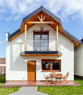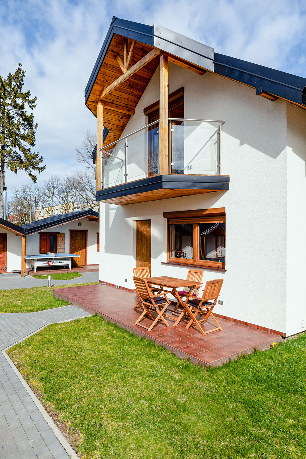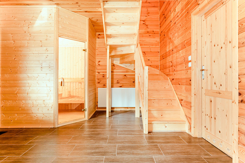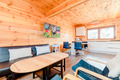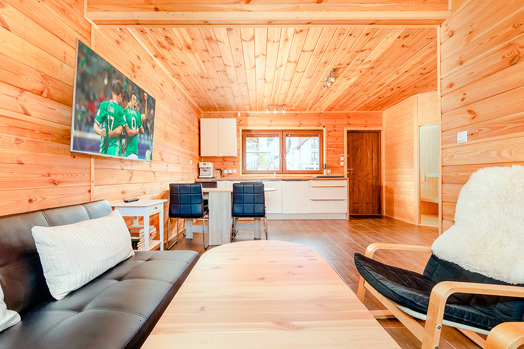 PL 50.9 Ferienhaus 2-5 Pers.: Sehr schönes 3-Zimmer-Ferienhaus mit 65 qm Wohnfläche über 2 Etagen. Parterre: Großzügiger Wohn-/Essraum mit Sofa (Klappcouch 1 Pers.), Couchtisch, Flachbild Sat-TV mit deutschen Programmen, Esstisch, moderner Küchenzeile (2 Platten-Induktionsherd). Sauna. Bad: Whirlpool, Wb, WC. Wendeltreppe ins Dachgeschoß: Doppelzimmer. 2-Bettzimmer mit Balkon. Bad: Dusche, Wb, WC. Terrasse mit Sitzmöbeln, Grill.