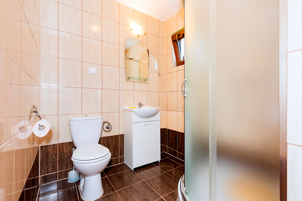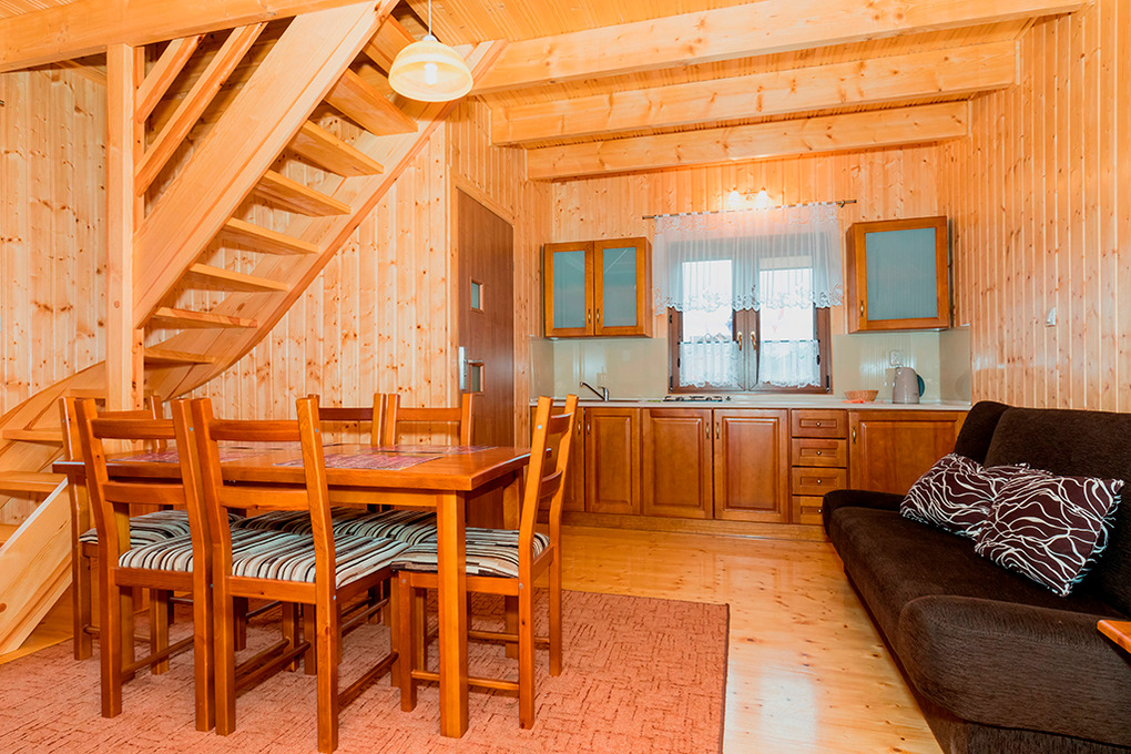 Rustikale Holzchalets mit gepflegter Einrichtung. Kostenloses Internet über WLan. Heizung mit E-Radiatoren (Bestellung, Gebühr), Klimaanlage mit Heizfunktion im EG (nur PL 50.25), Warmwasser über E-Boiler. Terrasse mit Sitzmöbeln, Grill. 1 Parkplatz/Ferienhaus (PL 50.24) bzw. 2 Parkplätze/Ferienhaus (PL 50.25) auf dem umzäunten Grundstück (Gebühr).