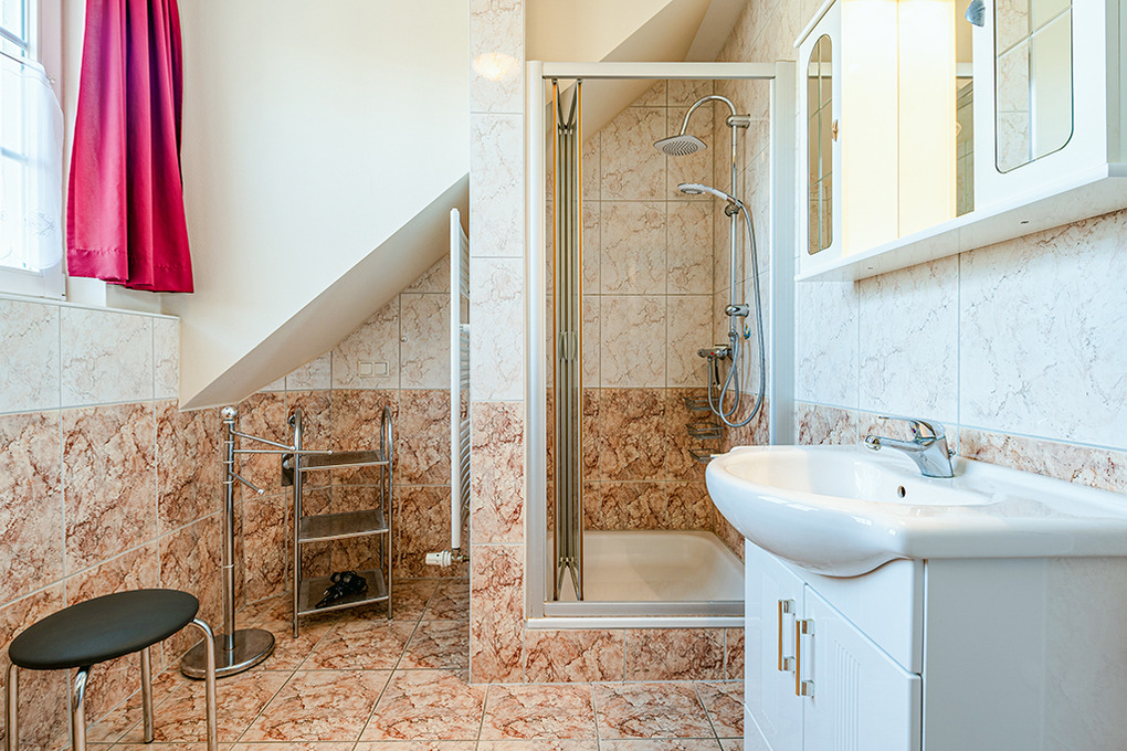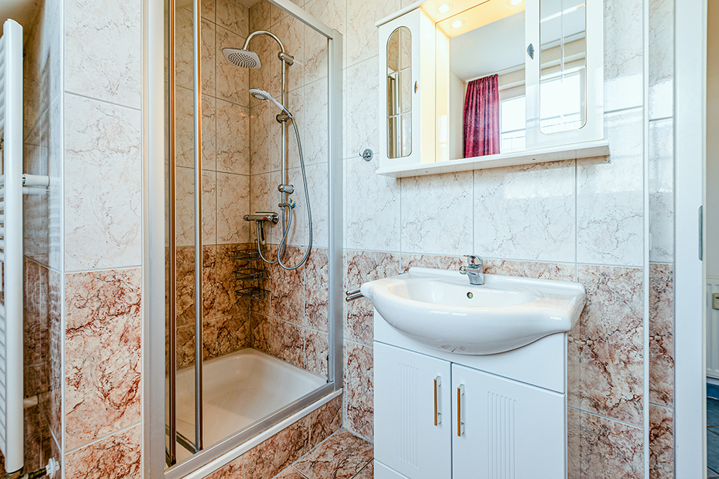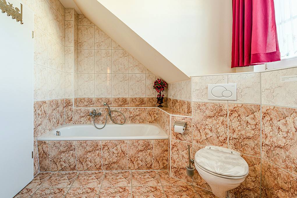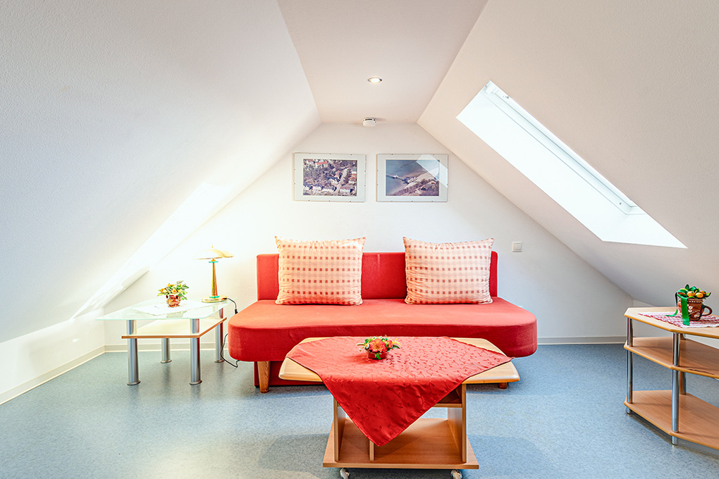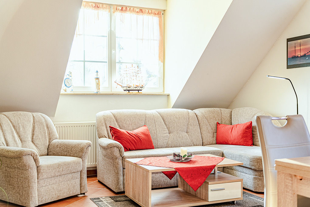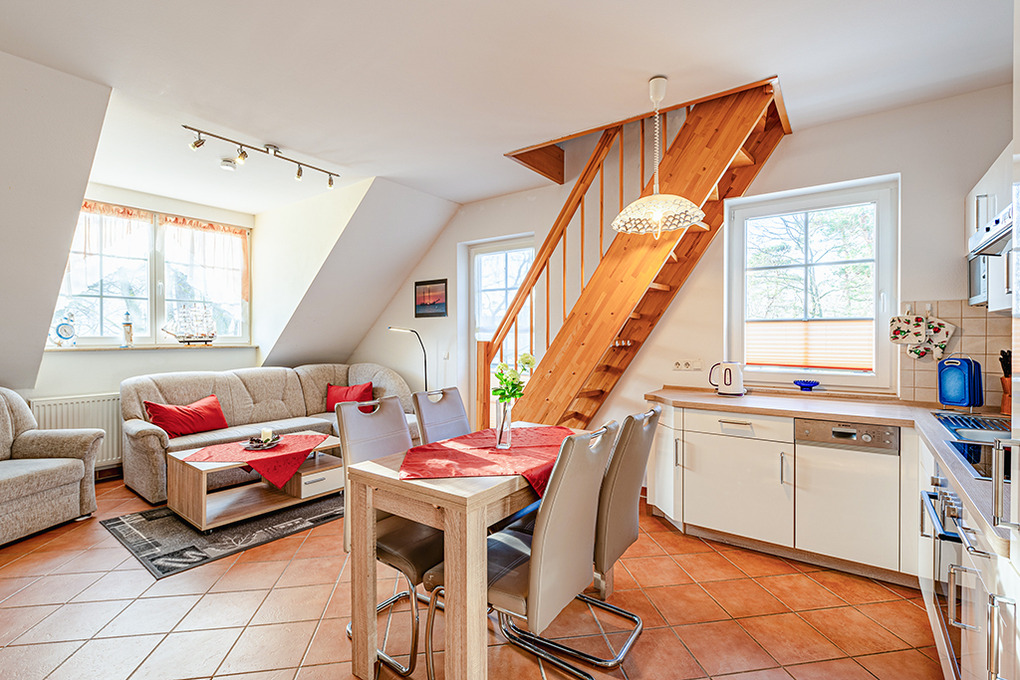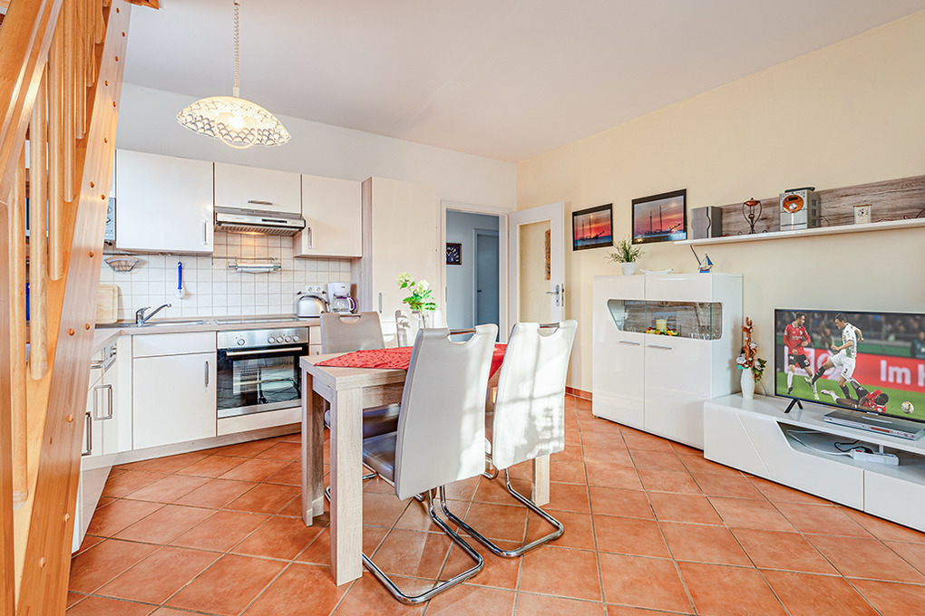D 92.46A Wohnung 2-3 Pers.: 3-Zimmerwohnung mit 63 qm Wohnfläche über 2. Etagen. 1. Etage: Heller Wohn-/Essraum (leichte Dachschrägen) mit gemütlicher Essecke, moderner Küchenzeile (Backofen, Mikrowelle, Spülmaschine). Doppelzimmer. Bad: Bw, Du, Wb, WC. Balkon. Treppe in die 2. Etage (Dachschrägen): Wohn-/Schlafraum mit Couch (Schlafcouch 1 Pers.), Sat-TV.