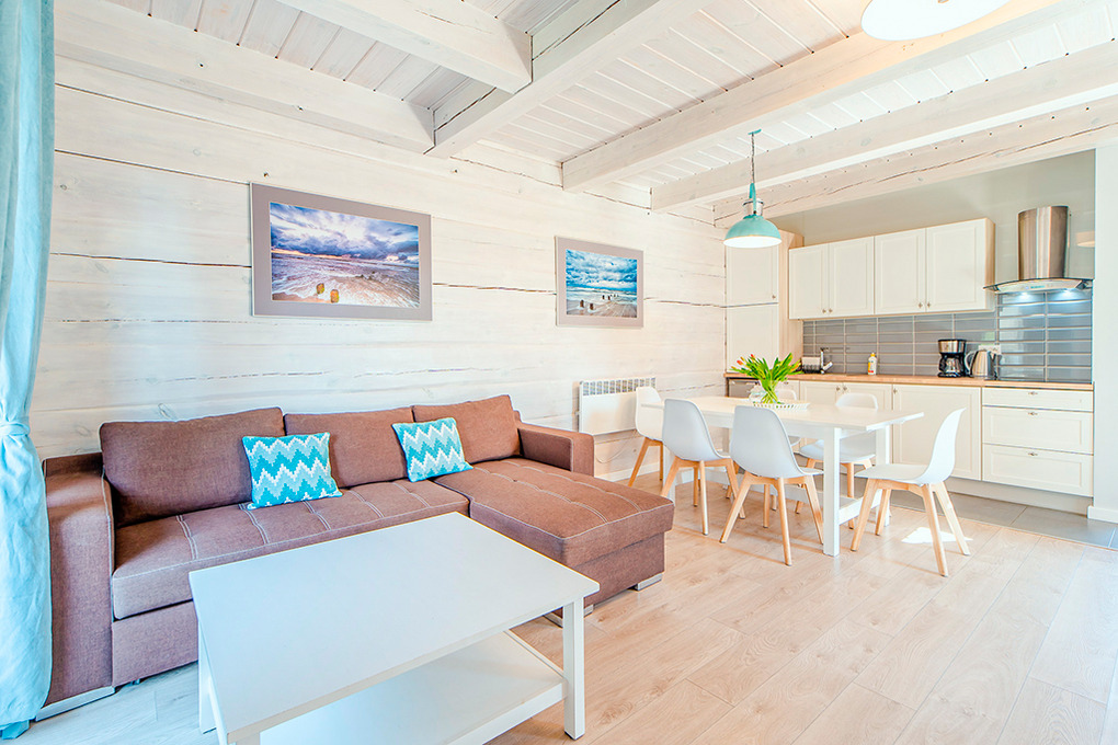 PL 41.3 Ferienhaus 2-8 Pers.: Komfortables 3-Zimmer-Reihenhaus mit ca. 80 qm Wohnfläche über 2 Etagen. Parterre: Wohn-/Essraum mit Ecksofa (Ausziehcouch 2 Pers.), Flachbild Sat-TV (deutsche Programme), Esstisch, moderner Küchenzeile (4 E-Platten Ceranfeld, Abzugshaube, Mikrowelle). Bad: Du, Wb, WC, Waschmaschine. 1. Etage: Zwei 3-Bettzimmer mit Doppelbett, Einzelbett.
