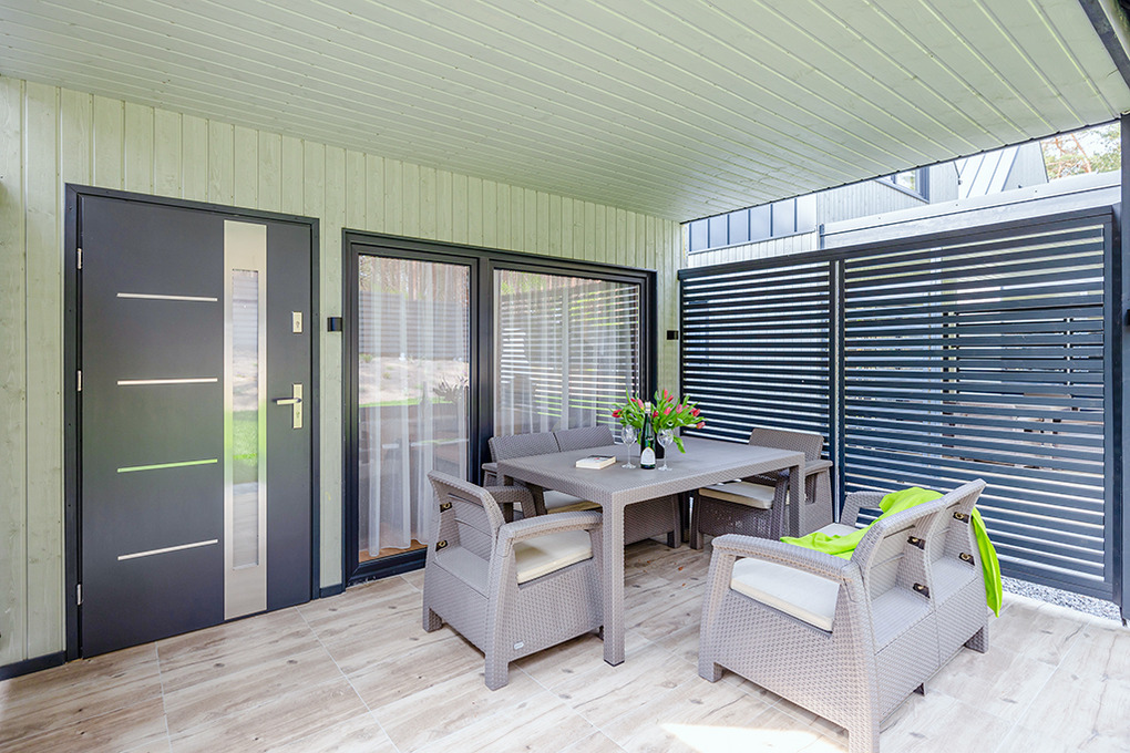 Haus: Schöne, stilvolle Ferienhausanlage, 2022 neu erbaut. Nichtraucherhäuser. Moderne, geschmackvolle Einrichtung. Alle Häuser mit Klimaanlage (Kühl- und Heizfunktion). Kostenloses Internet über W-Lan. Überdachte Terrasse mit Sitzmöbeln, Grill. 2 Pkw-Stellplätze/Haus auf dem abgeschlossenen Grundstück. Zwei Waschmaschinen in der Anlage zur gemeinschaftlichen Nutzung.