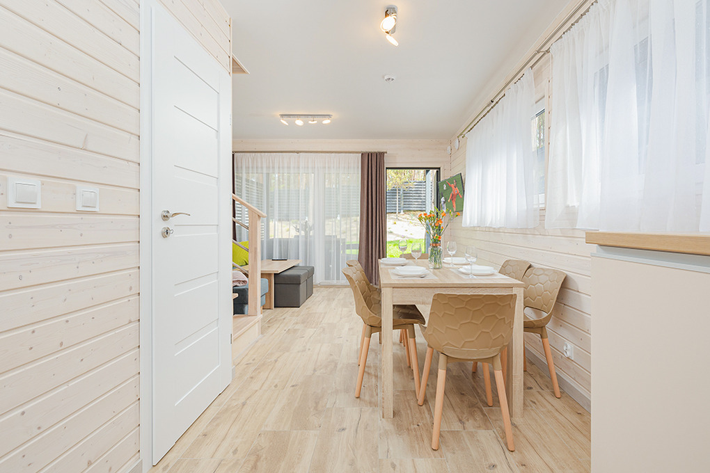 PL 30.9 Ferienhaus 2-6 Pers.: 3-Zimmer-Ferienhaus mit 65 qm Wohnfläche über 2 Etagen. Parterre: Wohn-/Essraum mit Couchgarnitur (Ausziehcouch 2 Pers.), Flachbild Sat-TV (deutsche Programme), großem Esstisch, Küchenzeile (Induktionsherd 4 Platten, Abzugshaube, Mikrowelle, Spülmaschine). Modernes Bad mit Du, Wb, Bidet, WC. 1. Etage: 3-Bettzimmer mit Doppelbett, Einzelbett, TV. 3-Bettzimmer mit Doppelbett, Einzelbett. Kleines Bad mit Wb, WC. Hinweis: Die max. Belegung darf 6 Pers. nicht überschreiten.