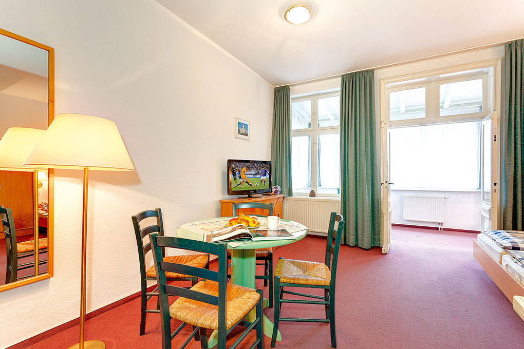 D 91.21A Wohnung 2-4 Pers.: 2-Zimmerwohnung, 40 qm Wohnfläche, 2. Etage. Wohn-/Essraum mit Doppelbett, Esstisch, Küchenzeile. Separater, schöner, heller Wintergarten mit Ausziehcouch (2 Pers.), Sitzecke. Bad/WC.