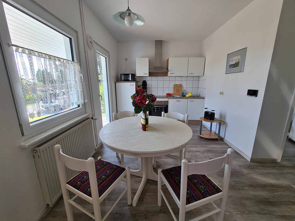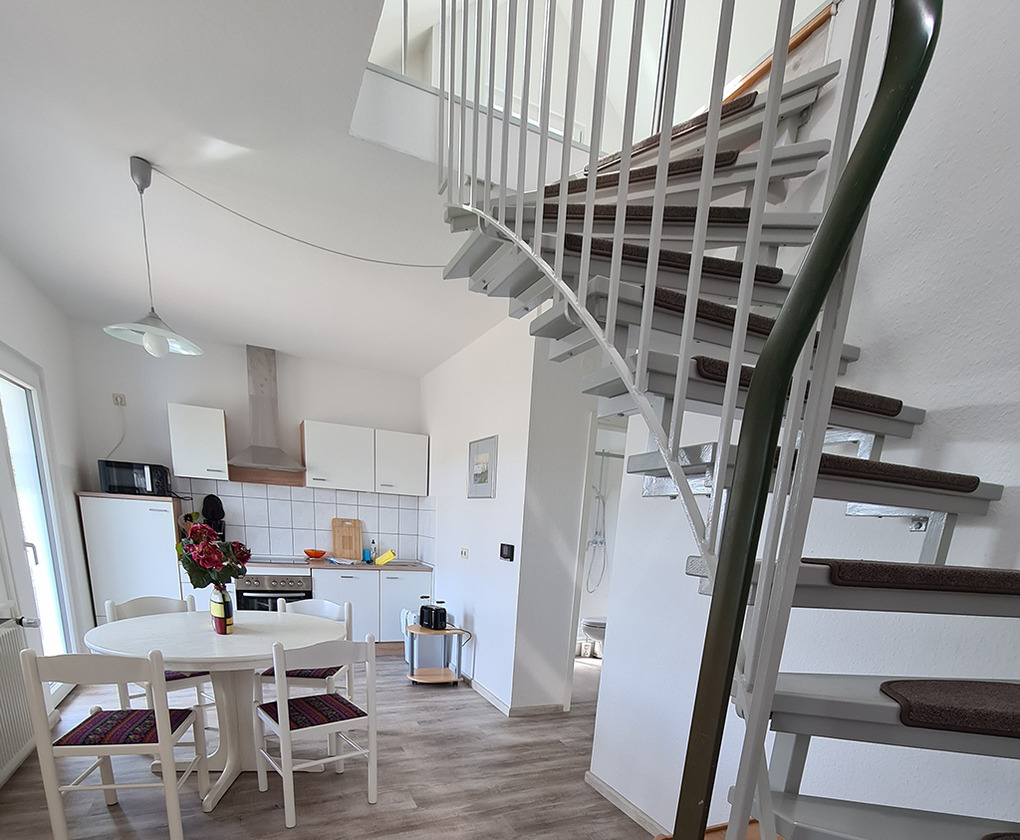 D 26.2 Ferienhaus 1-4 Pers.: 3-1/2 Zimmerhaushälfte mit 80 qm Wohnfläche über 2 Etagen. Parterre: Freundliche Wohnküche mit Esstisch, Küchenzeile (Backofen, Mikrowelle, Spülmaschine). Doppelzimmer. 2-Bettzimmer. Bad/WC. 1. Etage mit leichten Dachschrägen: Gemütliches Wohnzimmer mit Sitzgarnitur, Sat-TV, seitlichem Wasserblick.