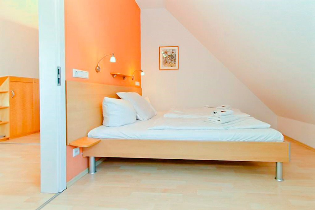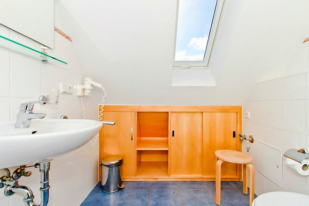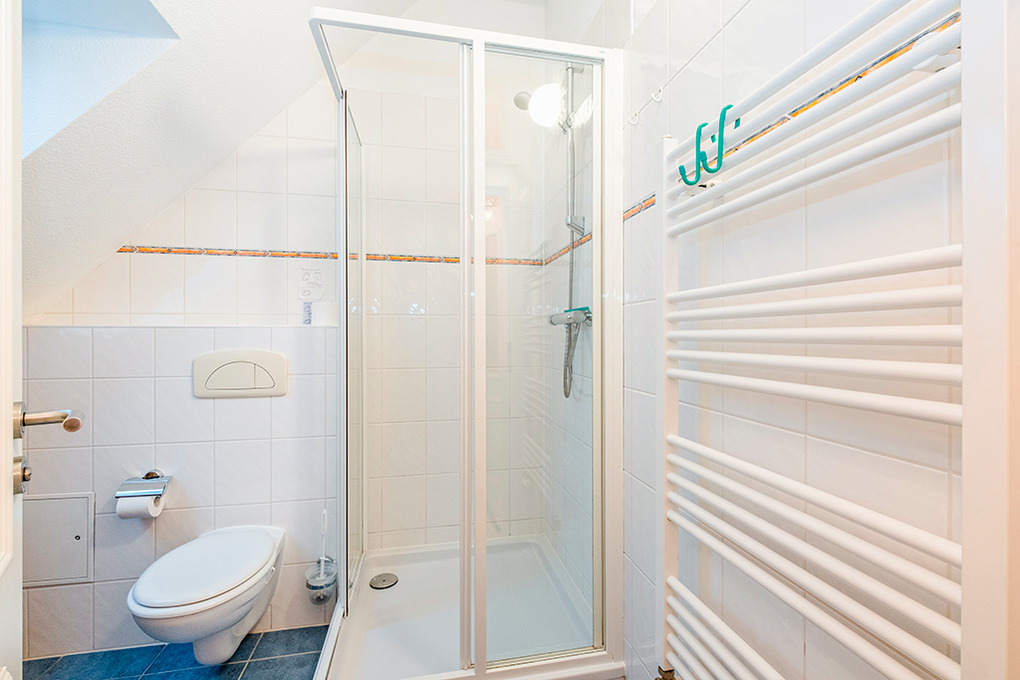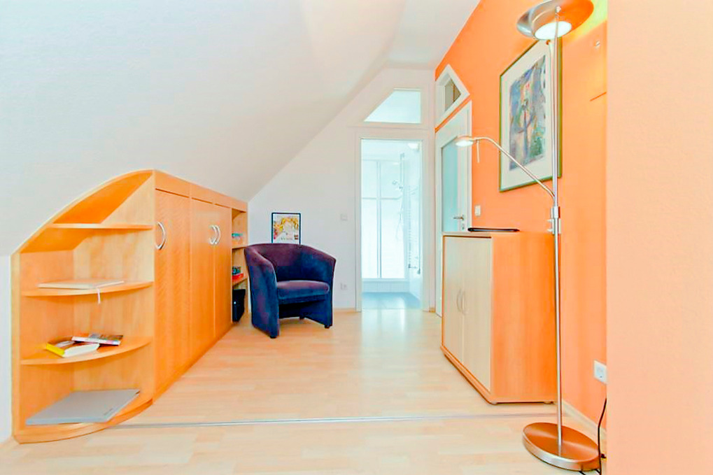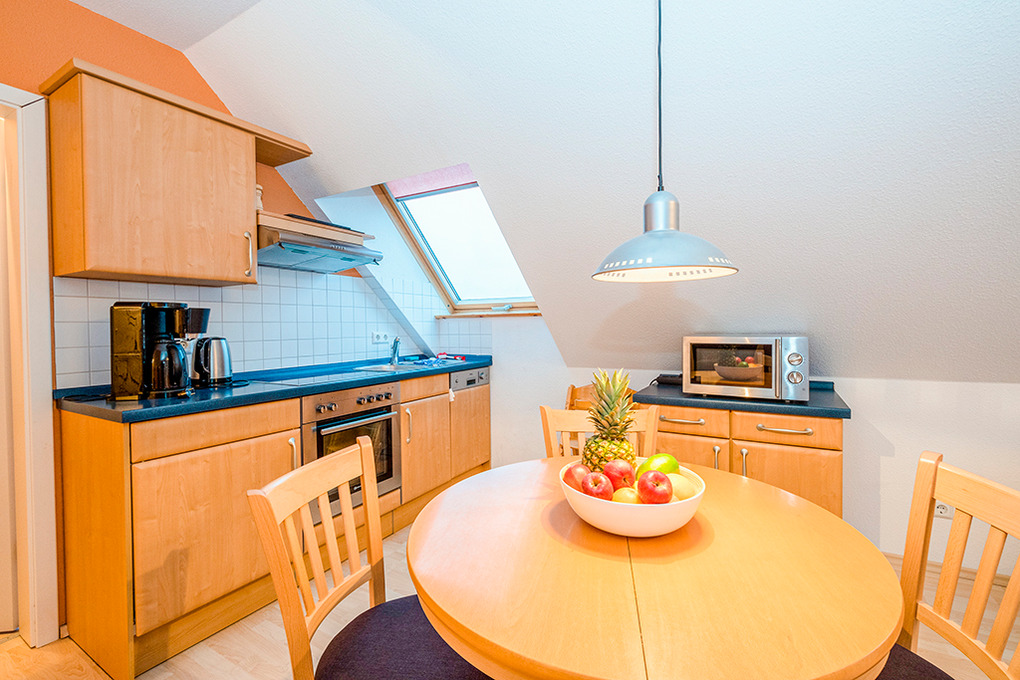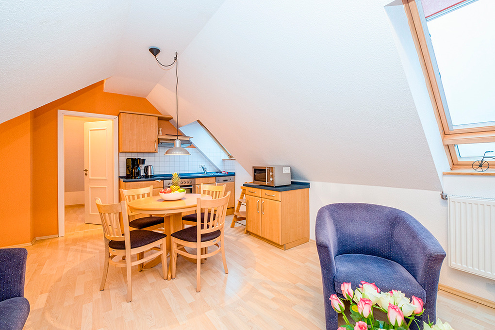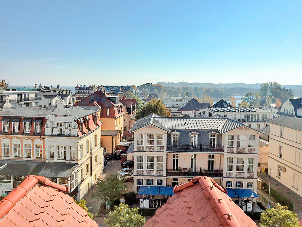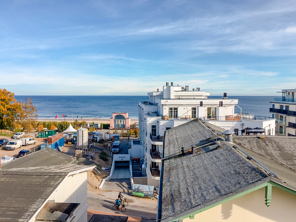 D 12.17 Wohnung 2-4 Pers.: 2-Zimmerwohnung mit 45 qm Wohnfläche, 3. Etage mit Meerblick (Dachschrägen). Wohn-/Essraum mit gemütlicher Couchgarnitur (Ausziehcouch 2 Pers.), Kabel-TV, BluRay-Player, Radio/CD, Esstisch, Küchenzeile (Backofen, Mikrowelle, Spülmaschine). Doppelzimmer mit TV, DVD. Bad/WC mit Haarfön. Schöner Blick auf die Ostsee über die Dächer der umliegenden Villen.