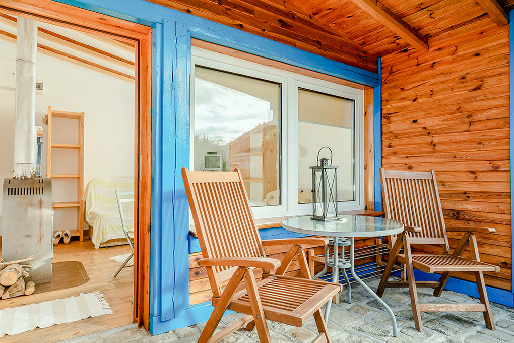 PL 34.23 Ferienhaus 1-4 Pers.: Gemütliches 2-Zimmerhaus mit ca.30 qm Wohnfläche. Wohn-/Essraum mit Kamin, 2 Sofas (Schlafcouch 2 Pers.), kleinem Tisch, Sat-TV mit deutschen Programmen. Doppelzimmer mit Schlafsofa (2 Pers.), Pantryküche (2 E-Platten, Abzugshaube). Bad/WC. Schöne überdachte Terrasse mit Sitzmöbeln.