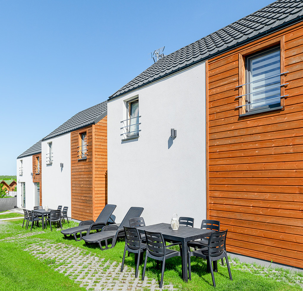 PL 31.6 Ferienhaus 2-6 Pers. Komfortables 3-Zimmerhaus mit ca. 60 qm Wohnfläche über 2 Etagen. Parterre: Wohn-/Essraum mit Ecksofa (Ausziehcouch 2 Pers.), Flachbild Sat-TV mit deutschen Programmen, Esstisch, kleiner Küchenzeile (2 E-Platten, Abzugshaube, Mikrowelle, Spülmaschine). Bad: Du, Wb, WC. 1. Etage: offenes 3-Bettzimmer mit Doppelbett, Einzelbett. Dahinter weiteres 3-Bettzimmer mit Doppelbett, Einzelbett. Terrasse mit Sitzmöbeln, Grill.