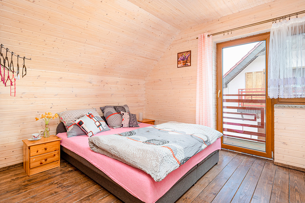 PL 31.11 Ferienhaus 3-8 Pers. Schönes, gemütliches 3-Zimmerhaus mit 80 qm Wohnfläche über 2 Etagen. Großer, heller Wohn-/Essraum mit rustikaler Holzbalkendecke, großzügigem Ecksofa, Couchtisch, Sat-TV (deutsche Programme), großem Esstisch, gut ausgestatteter Küchenzeile (Gasherd 4 Flammen, Abzugshaube, Backofen, Mikrowelle, Tiefkühlschrank 60 Liter). Bad: Du, Wb, WC. Treppe in die 1. Etage (Dachgeschoss): Zwei 4-Bettzimmer mit Doppelbett, 2 Einzelbetten, Balkon. Kleines Bad mit Wb, WC.