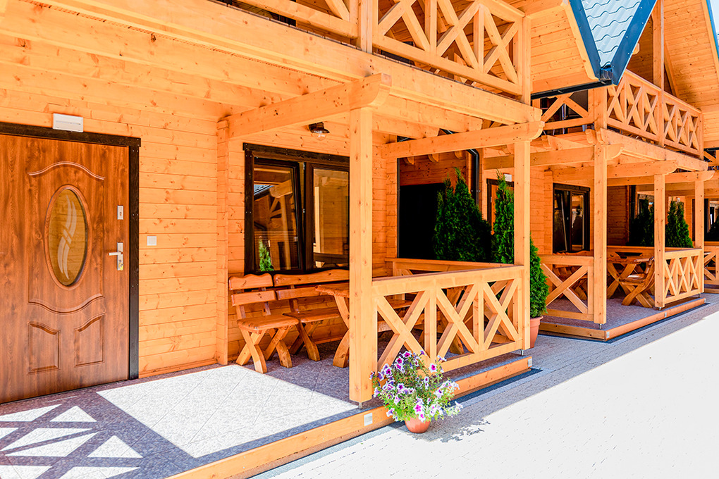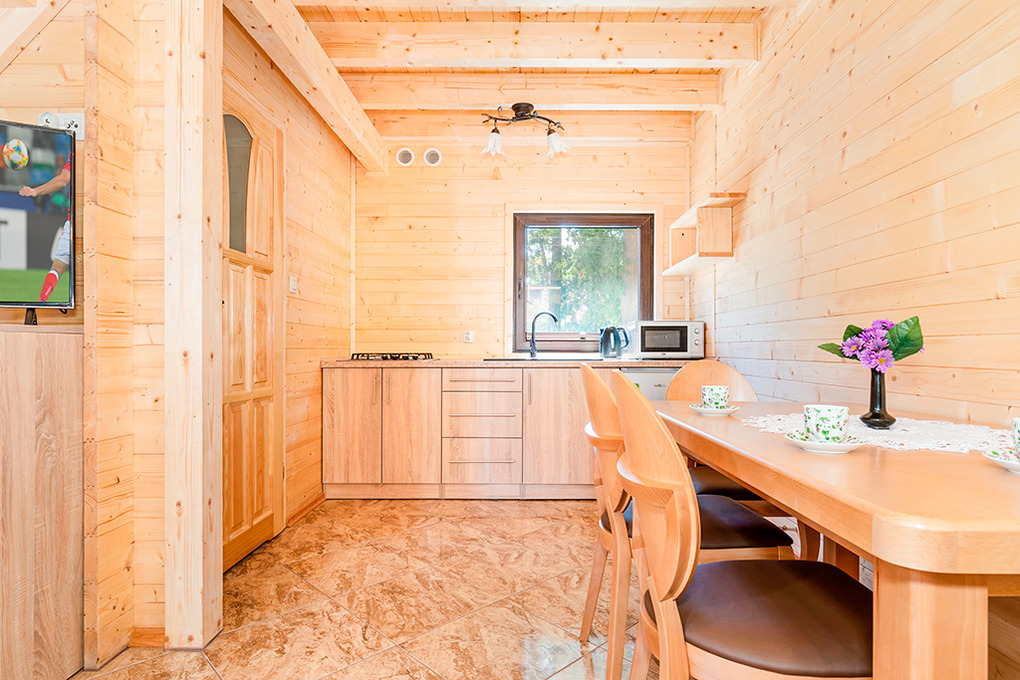Haus: Schöne Ferienhausanlage mit 7 neuen Holzchalets, 2018 neu erbaut. Freundliche, geschmackvolle Einrichtung. Kostenloses Internet über Wi-Fi. Heizung mit E-Radiatoren. Warmwasser über E-Boiler (80 l). Terrasse mit Sitzmöbeln. Grillplatz, kleiner Spielplatz (Rutsche, Klettergerüst, Sandkasten) zur gemeinschaftlichen Nutzung. 1 Pkw-Stellplatz/Haus auf dem umzäunten Grundstück.