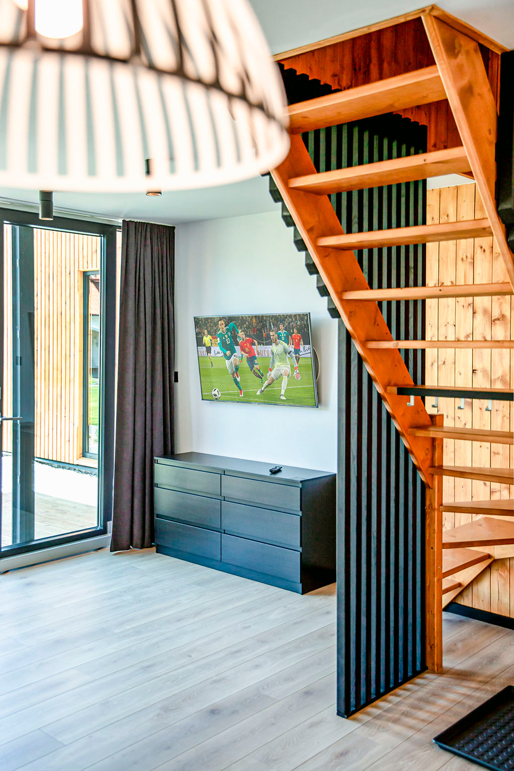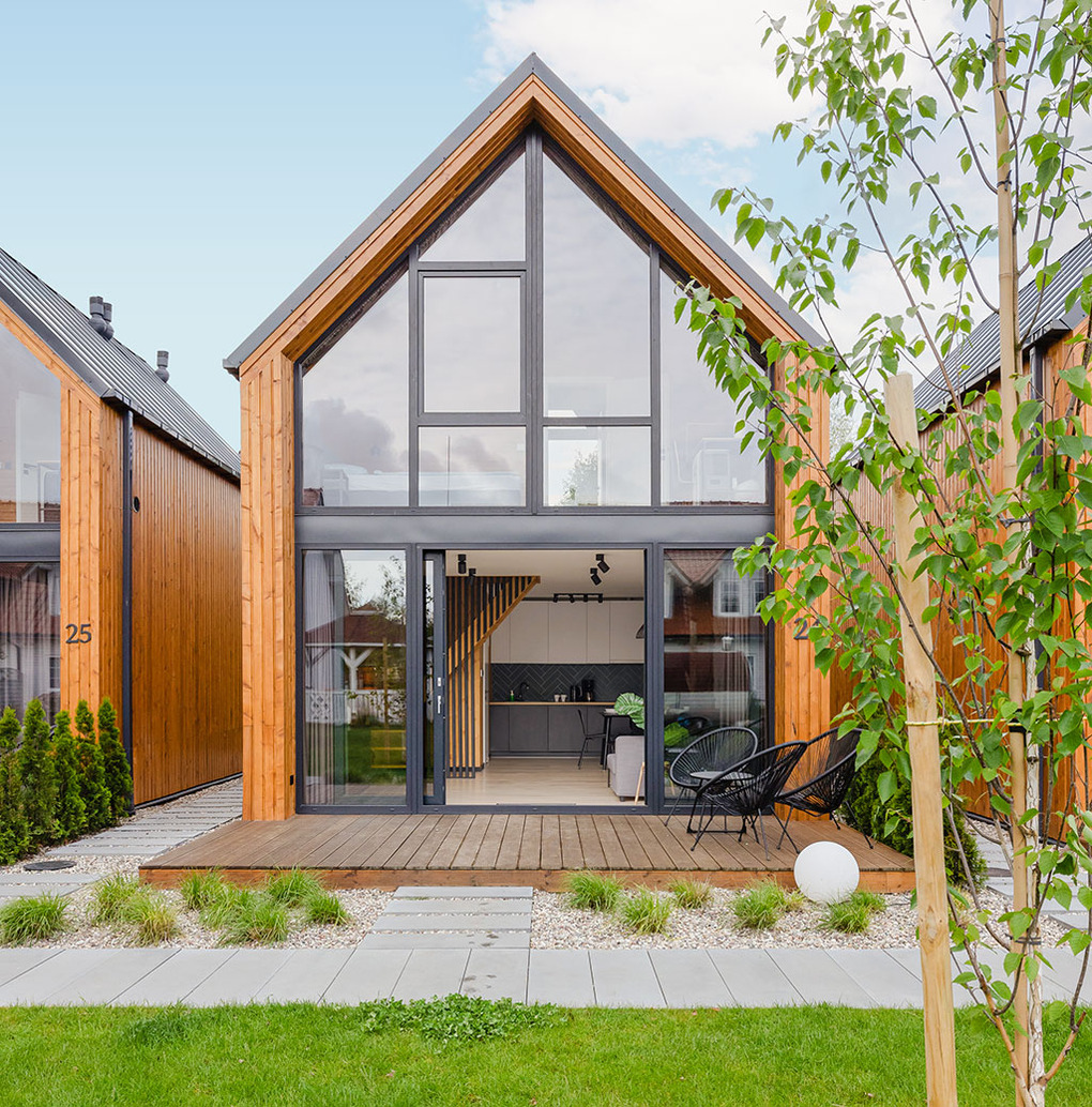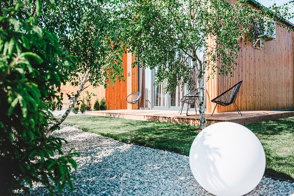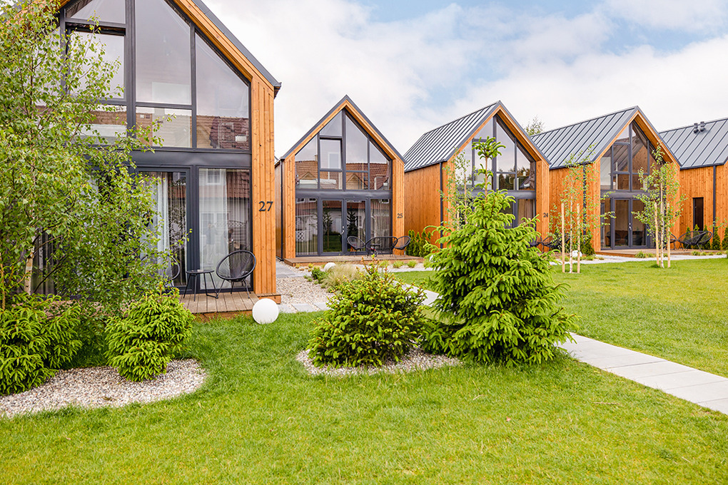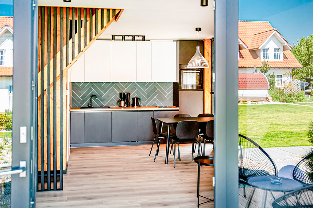 Haus: Schöne, stilvolle Ferienhausanlage, 2021 neu erbaut. Nichtraucherhäuser. Moderne, geschmackvolle Einrichtung. Alle Häuser mit Klimaanlage (Kühl- und Heizfunktion). Kostenloses Internet über W-Lan. Großzügige Terrasse mit Sitzmöbeln. Sauna und Grill zur Gemeinschaftsnutzung im Garten. Schöner Spielplatz für Kinder. 1 Pkw-Stellplatz/Haus vor dem Grundstück. Eine Waschmaschine in der Anlage zur gemeinschaftlichen Nutzung.