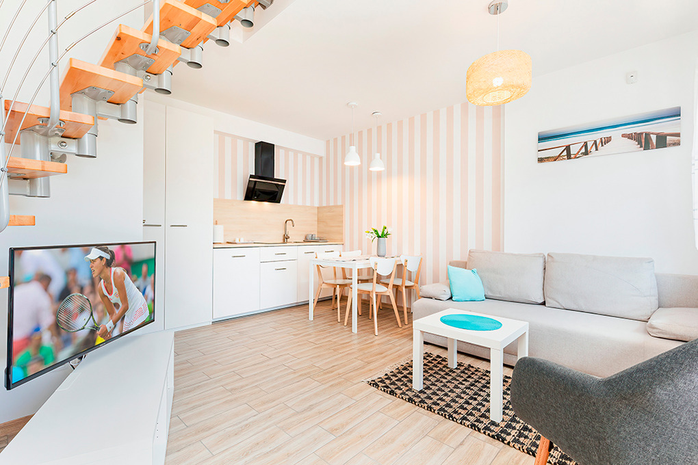 PL 41.9 Ferienhaus 2-5 Pers.: Gemütliches 3-Zimmer-Reihenhaus mit ca. 40 qm Wohnfläche über 2 Etagen. Parterre: heller, freundlicher Wohn-/Essraum mit Sitzgarnitur (Ausziehsofa 1 Pers.), Sat-TV, Esstisch, Küchenzeile (2 Induktionsplatten, Anzugshaube). Bad/WC. 1. Etage: Zwei 2-Bettzimmer.
