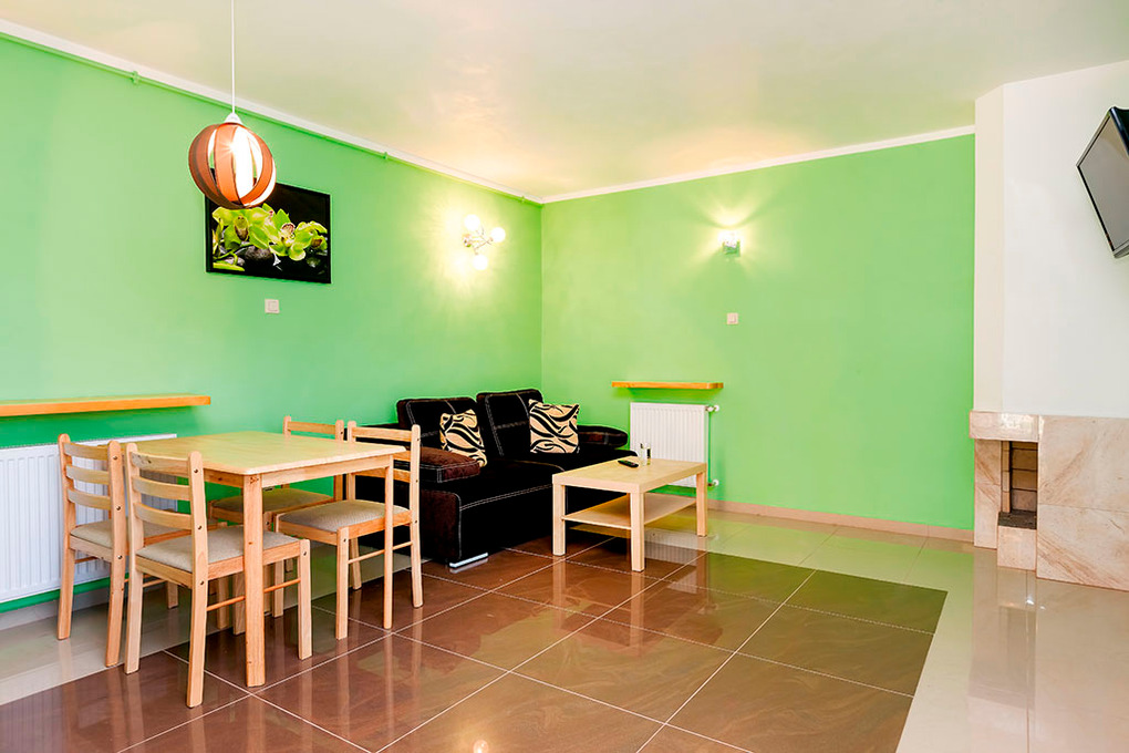 Haus: Schöne Reihenhäuser mit Kamin und freundlicher Einrichtung. Zentralheizung, Warmwasser über Durchlauferhitzer. Große Terrasse mit Sitzmöbeln. Nur auf der Terrasse Internetempfang (WiFi). Kleiner Garten. Parkplatz auf umzäunten Grundstück.