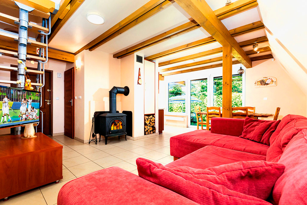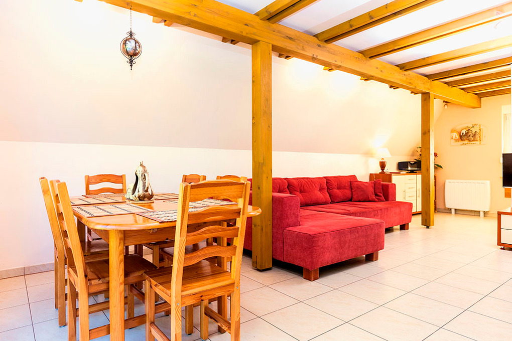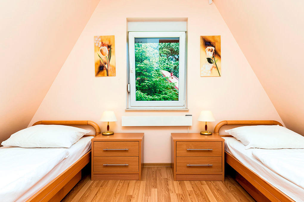 PL 60.5 Ferienhaus 2-6 Pers.: Niveauvolles 3-Zimmerhaus mit ca. 75 qm Wohnfläche über 2 Etagen. Parterre: Begehbare Garderobe mit Safe. Schöner, großzügiger Wohn-/Essraum mit Kaminofen, Sitzgarnitur, Sat-TV (deutsche Programme), Esstisch, abgetrennter Schlafnische mit Schlafsofa (2 Pers.). Offene, moderne Einbauküche mit Spülmaschine. Bad/WC. 1. Etage: Doppelzimmer. 2-Bettzimmer. Sitzecke im Flur. Bad: Wb, WC.