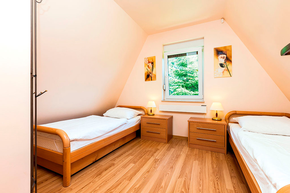 PL 60.5 Ferienhaus 2-6 Pers.: Niveauvolles 3-Zimmerhaus mit ca. 75 qm Wohnfläche über 2 Etagen. Parterre: Begehbare Garderobe mit Safe. Schöner, großzügiger Wohn-/Essraum mit Kaminofen, Sitzgarnitur, Sat-TV (deutsche Programme), Esstisch, abgetrennter Schlafnische mit Schlafsofa (2 Pers.). Offene, moderne Einbauküche mit Spülmaschine. Bad/WC. 1. Etage: Doppelzimmer. 2-Bettzimmer. Sitzecke im Flur. Bad: Wb, WC.