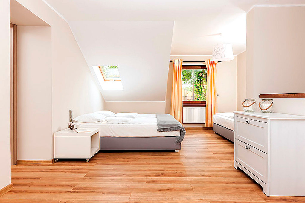 PL 55.18 Ferienwohnung 2-6 Pers.: 3-Zimmer-Reihenhaus mit 45 qm Wohnfläche über 2 Etagen. Parterre: Wohn-/Essraum mit Esstisch, Flachbild Sat-TV, Küchenzeile (2 Pl. E-Herd). Bad/WC. Treppe ins ausgebaute Dachgeschoss: 4-Bettzimmer mit Doppelbett, 2 Einzelbetten, offen zur Treppe. Dahinter Doppelzimmer.