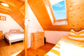 PL 34.7 Ferienhaus 2-5 Pers.: Gemütliche 3-Zimmerhaushälfte mit ca. 40 qm Wohnfläche über 2 Etagen. Parterre: Wohn-/Essraum mit Kaminofen, Ausziehsofa (1 Pers.), Sat-TV, Esstisch, Küchenzeile (2 E-Platten). Bad/WC. Steile Stiege ins Dachgeschoss mit Schrägen: Doppelzimmer offen zur Treppe. Dahinter zweites Doppelzimmer.