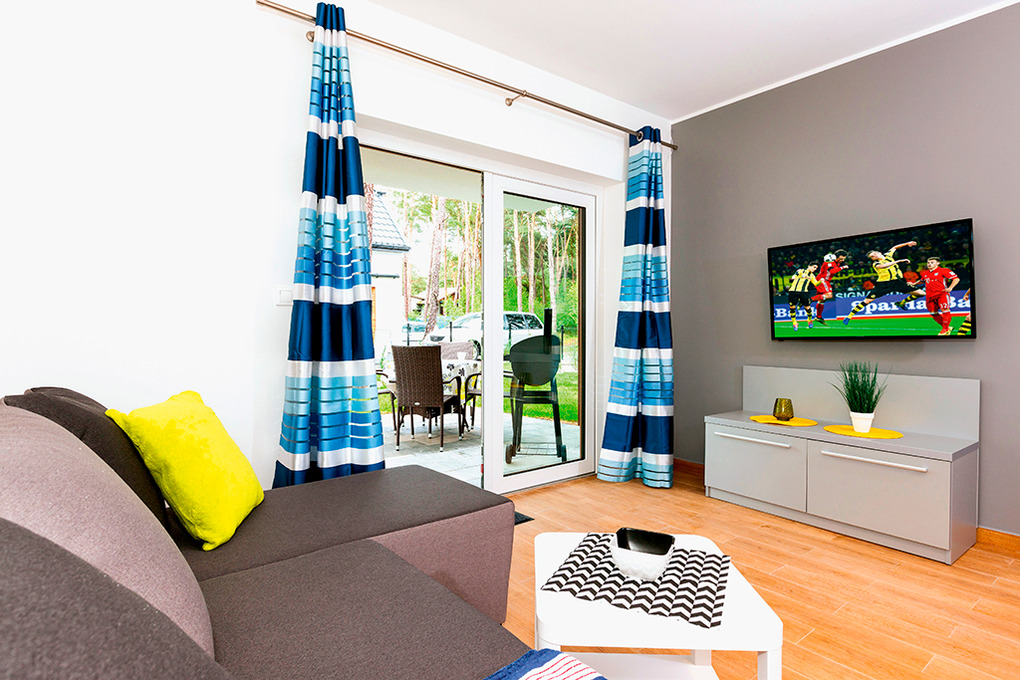 PL 13.3 Ferienhaus 2-6 Pers.: 3-Zimmer-Reihenhaus mit 55 qm Wohnfläche über 2 Etagen. Parterre: Großzügiger Wohn-/Essraum mit Ecksofa (Ausziehcouch 2 Pers.), Sat-TV (deutsche Programme), Internet (W-Lan), Esstisch, moderner Küchenzeile (2 E-Platten Ceranfeld, Abzugshaube, Mikrowelle, Spülmaschine). Bad/WC. 1. Etage: Doppelzimmer. 2-Bettzimmer. Terrasse mit Sitzmöbeln, Grill.