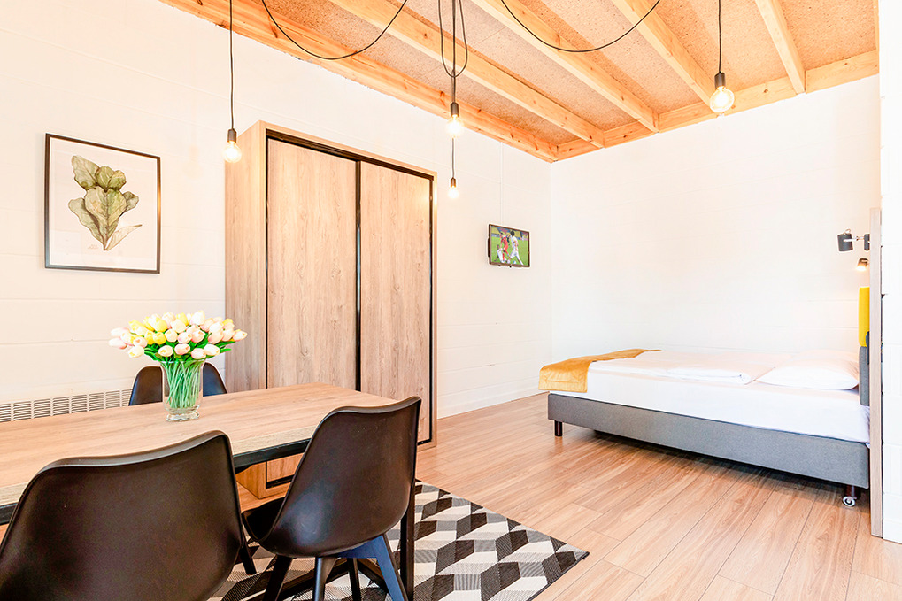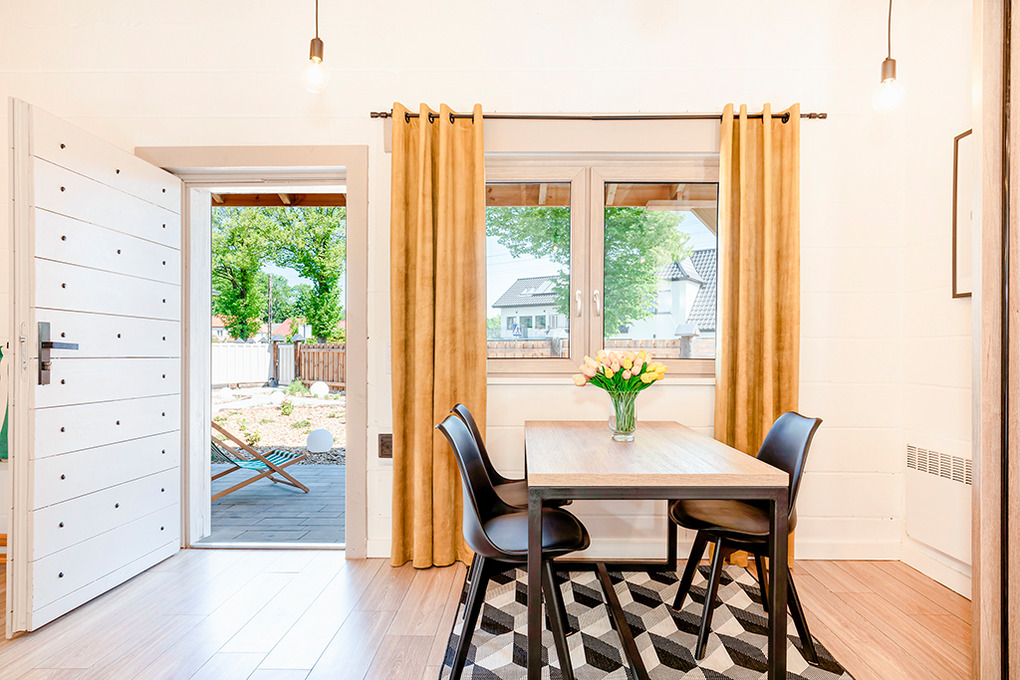 PL 55.22 Ferienwohnung 1-2 Pers.: Studio mit 32 qm Wohnfläche. Wohn-/Schlafraum mit Doppelbett, Flachbild Sat-TV, Esstisch, Küchenzeile (2 Pl. E-Herd, Abzugshaube). Bad/WC. Terrasse mit Sitzmöbeln.