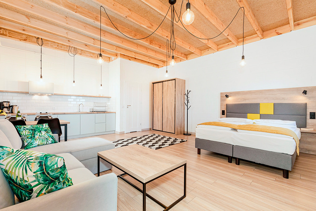 PL 55.24 Wohnung 2-4 Pers.: Studio mit 41 qm Wohnfläche. Wohn-/Schlafraum mit Couchgarnitur (Schlafcouch 2 Pers.), Doppelbett, Esstisch, Flachbild Sat-TV, Küchenzeile (2 Pl. E-Herd, Abzugshaube). Bad/WC. Terrasse mit Sitzmöbeln.