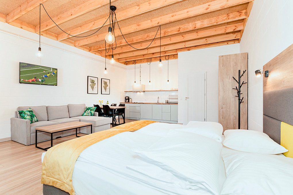 PL 55.24 Wohnung 2-4 Pers.: Studio mit 41 qm Wohnfläche. Wohn-/Schlafraum mit Couchgarnitur (Schlafcouch 2 Pers.), Doppelbett, Esstisch, Flachbild Sat-TV, Küchenzeile (2 Pl. E-Herd, Abzugshaube). Bad/WC. Terrasse mit Sitzmöbeln.