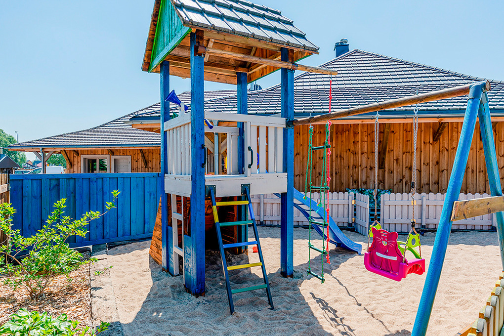 Haus: Schöne, gepflegte Ferienwohnungsanlage auf einem großzügigen, umzäunten Grundstück. In der Anlage Kinderspielplatz mit Schaukel, Sandkasten, Rutsche, Klettergerüst.