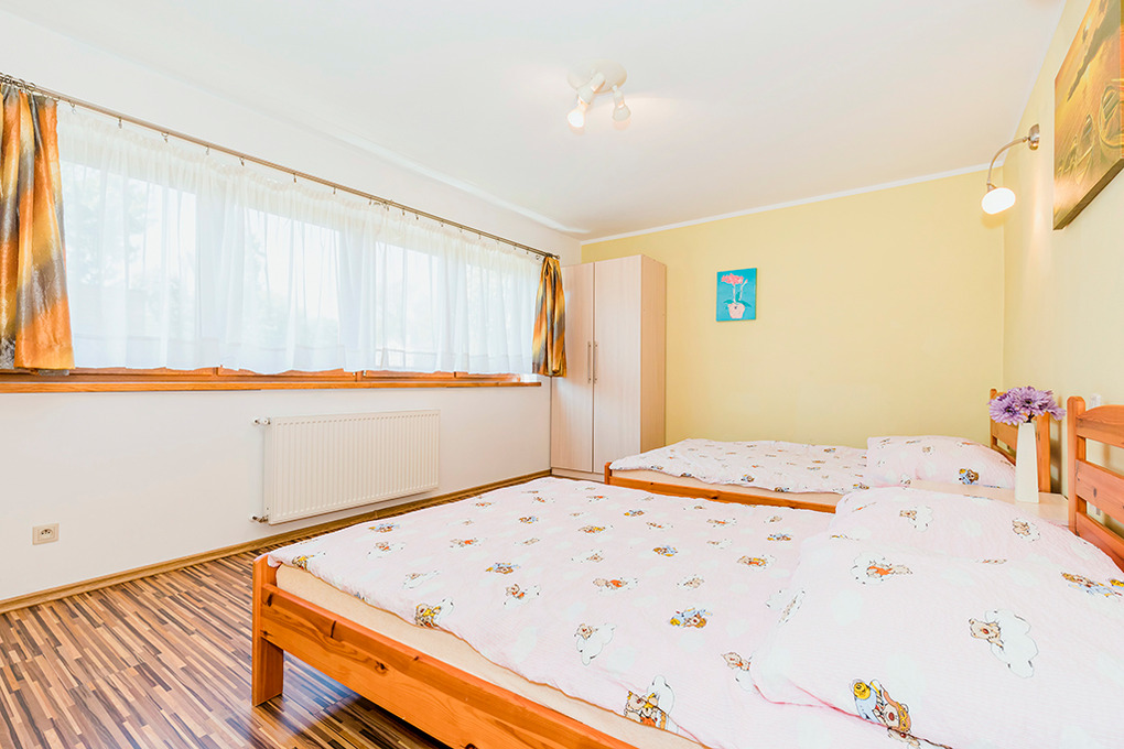 PL 55.25 Ferienhaus 3-8 Pers.: Gepflegtes, großes 3-Zimmerhaus mit 86 qm Wohnfläche über 2 Etagen. Parterre: Schöner, großzügiger Wohn-/Essraum mit Kamin, Sitzgarnitur, Sat-TV (deutsche Programme), Esstisch, Küchenzeile (Gaskocher 4 Fl.). Bad: Du, Wb, WC. 1. Etage: Zwei große 4-Bettzimmer mit 2 Doppelbetten (franz. Betten 140 cm Breite). Bad: Du, Wb, WC. Überdachte Terrasse mit Sitzmöbeln, Außenkamin.