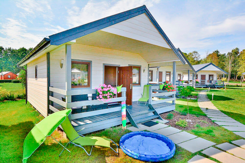 PL 75.11 Ferienhaus 2-5 Pers.: 3-Zimmer-Ferienhaus mit ca. 38 qm Wohnfläche. Erhöhtes Parterre: Wohn-/Essraum mit Sofa (Ausziehcouch 2 Pers.), Sat-TV mit deutschen Programmen, kostenloses Internet (W-Lan), Esstisch, Küchenzeile (2 E-Platten Induktion, Mikrowelle). Bad/WC. Doppelzimmer. 3- Bettzimmer mit Doppelbett, darüber ein Etagenbett. Überdachte Terrasse mit Sitzmöbeln.