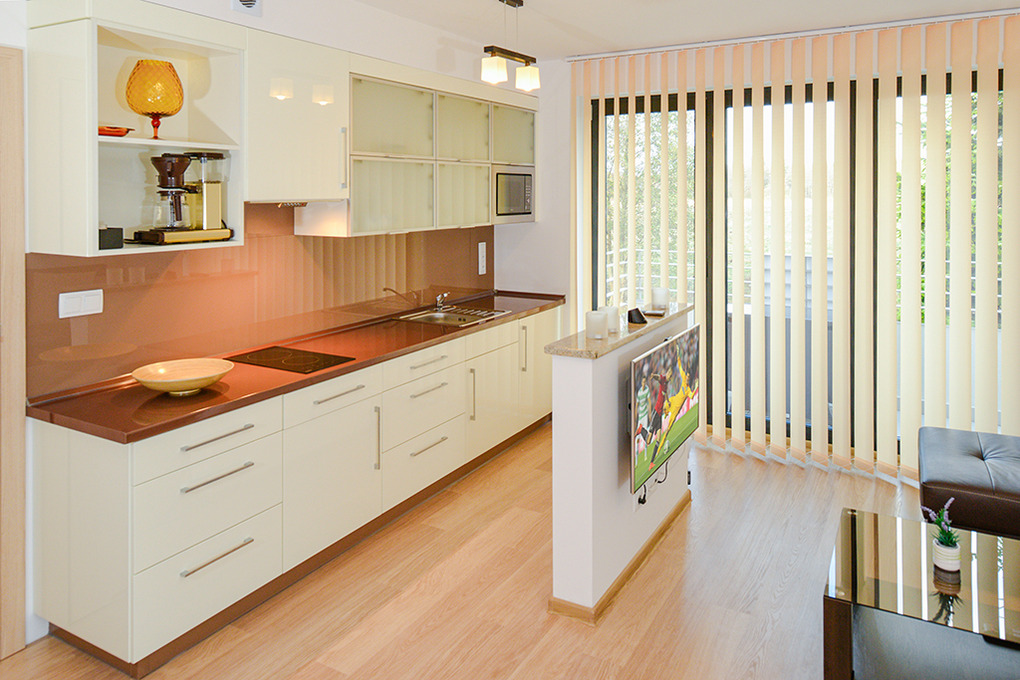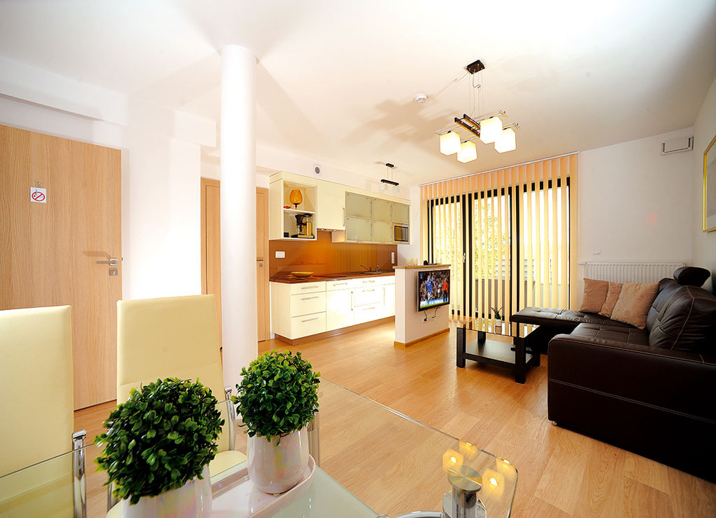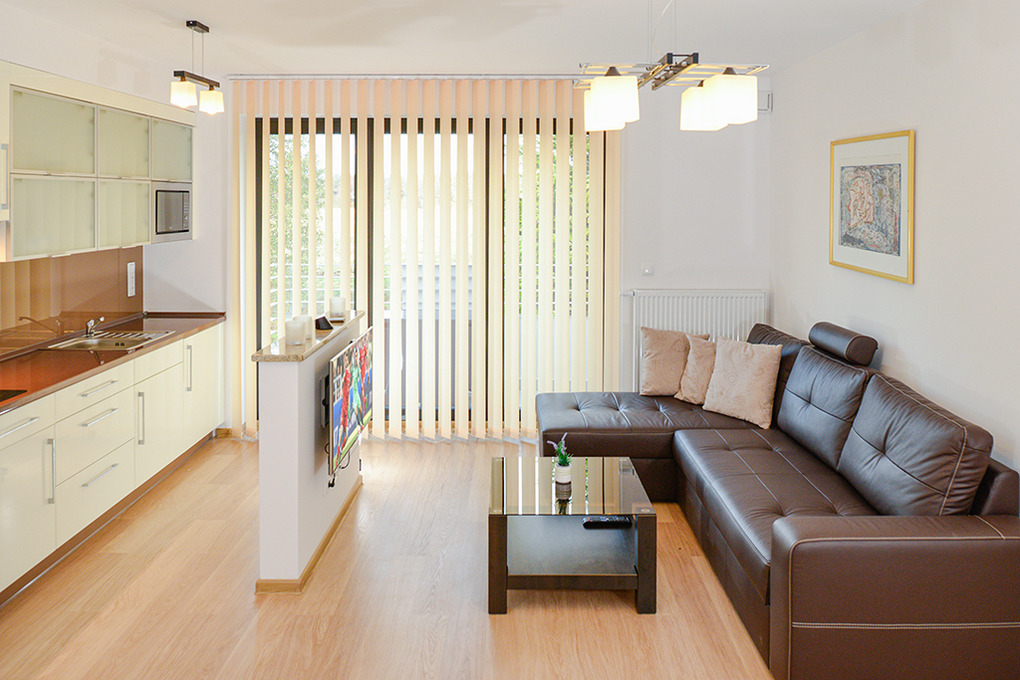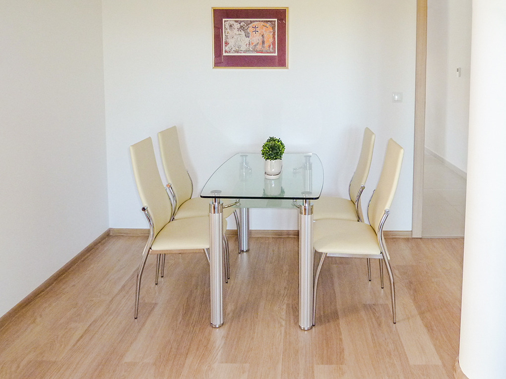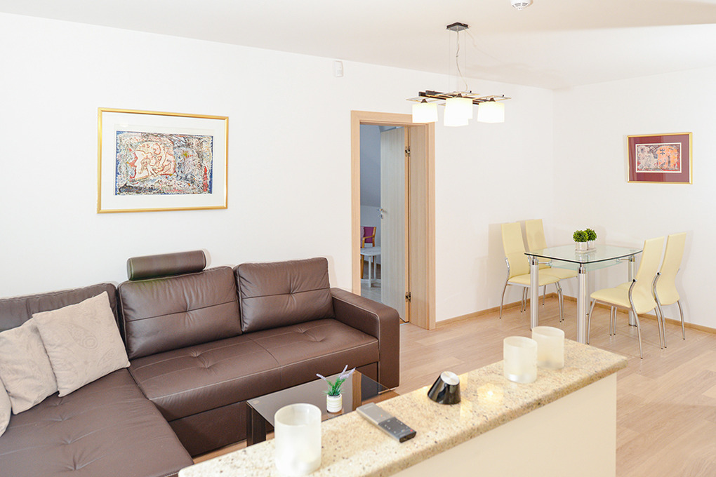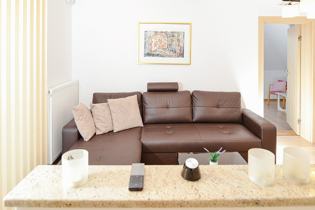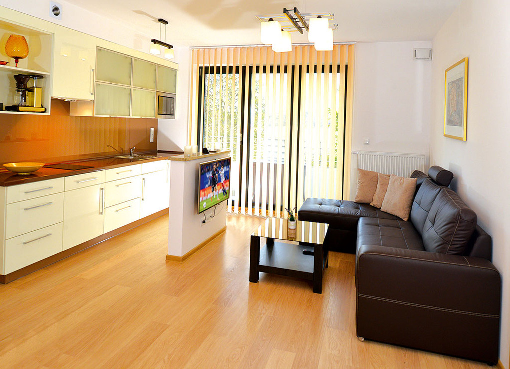 PL 41.12 Wohnung 1-4 Pers.: Niveauvoll eingerichtete 2-Zimmerwohnung mit 45 qm Wohnfläche, 1. Etage. Schöner Wohn-/Essraum mit Sitzgarnitur (Schlafsofa 2 Pers.), Sat-TV, Esstisch, Küchenzeile (2 Pl.-Ceranfeld, Mikrowelle). Doppelzimmer. Bad/WC. Balkon mit Sitzmöbeln.