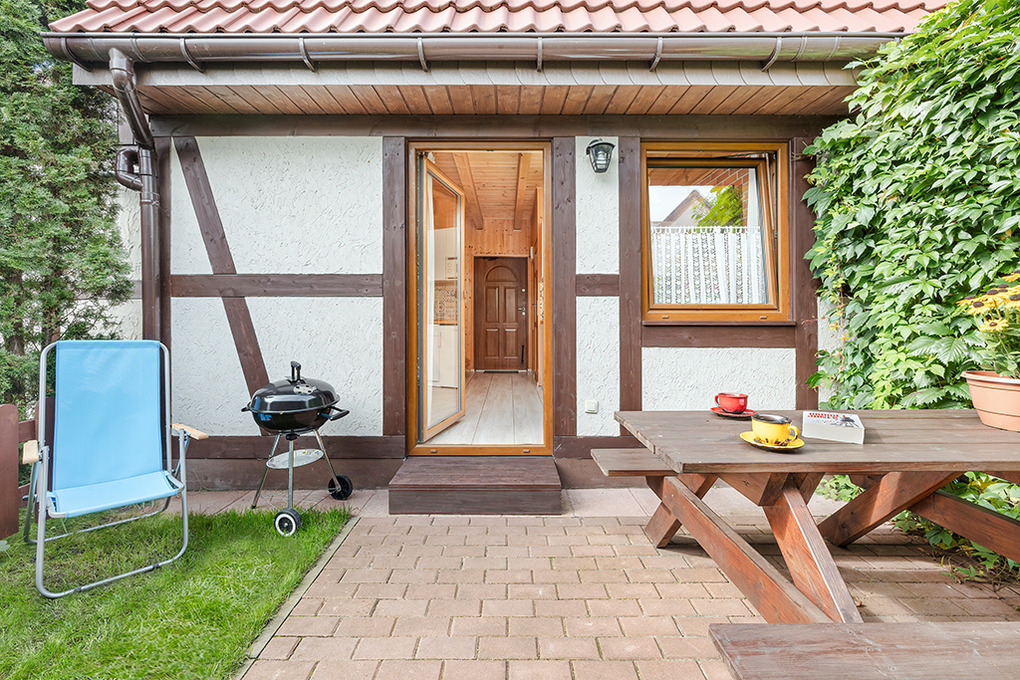 PL 66.10 Ferienhaus 2-6 Pers.: 2-Zimmer-Reihenhaus mit ca. 40 qm Wohnfläche über 2 Etagen. Parterre: Wohn-/Essraum mit Sofa (Ausziehcouch 2 Pers.), SAT-TV (6 dt. Programme), Internet (WLan), Esstisch, Küchenzeile (2 E-Platten Ceranfeld). Bad/WC. 1. Etage: 4-Bettzimmer mit Doppelbett, zwei Einzelbetten. Kleine Sitzecke im Garten.