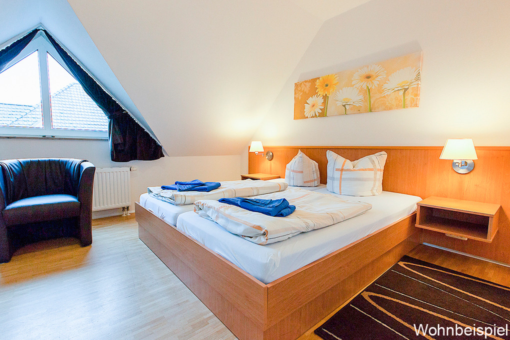 D 138.22 Wohnung 2-4 Pers.: 2-Zimmerwohnung, 65 qm Wohnfläche, Dachgeschoss mit leichten Schrägen. Wohn-/Essraum mit Sitzgruppe, Schlafsofa (2 Pers.), Sat-TV, Telefon, Essecke, Küchenzeile (Backofen). Doppelzimmer. Bad/WC. Große Dachterrasse (Sitzmöbel).
