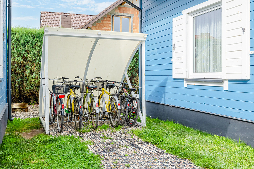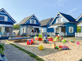 Ort: Rewal. Kleine Ferienhaussiedlung in ruhiger Lage am Ortsrand. Ostseestrand 490 m. Ortsmitte 800 m. Einkaufen, Restaurants 300 m.