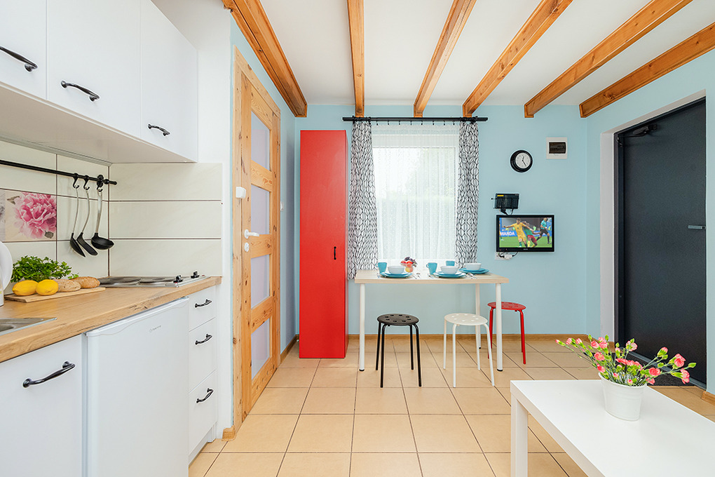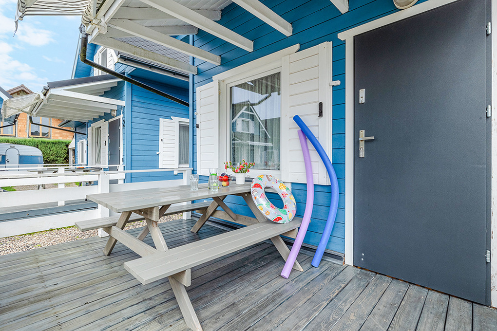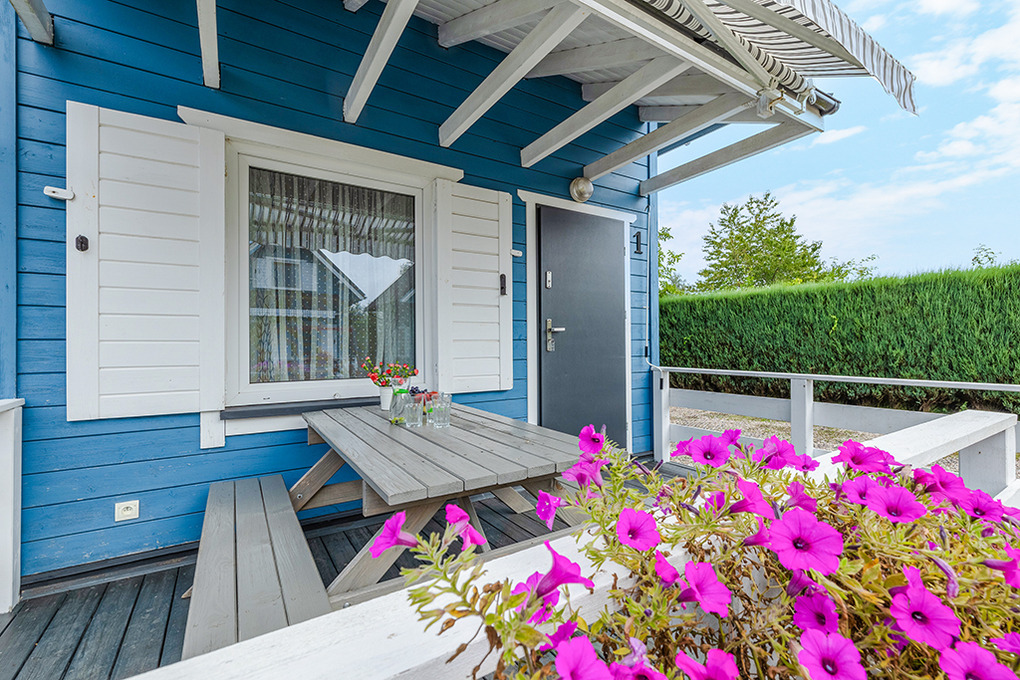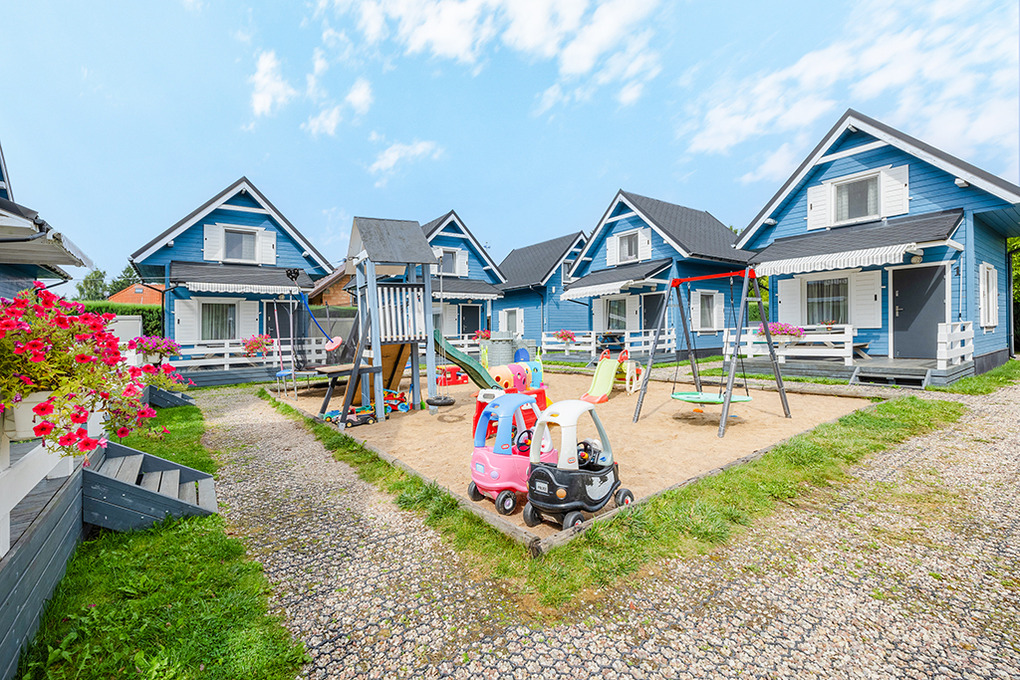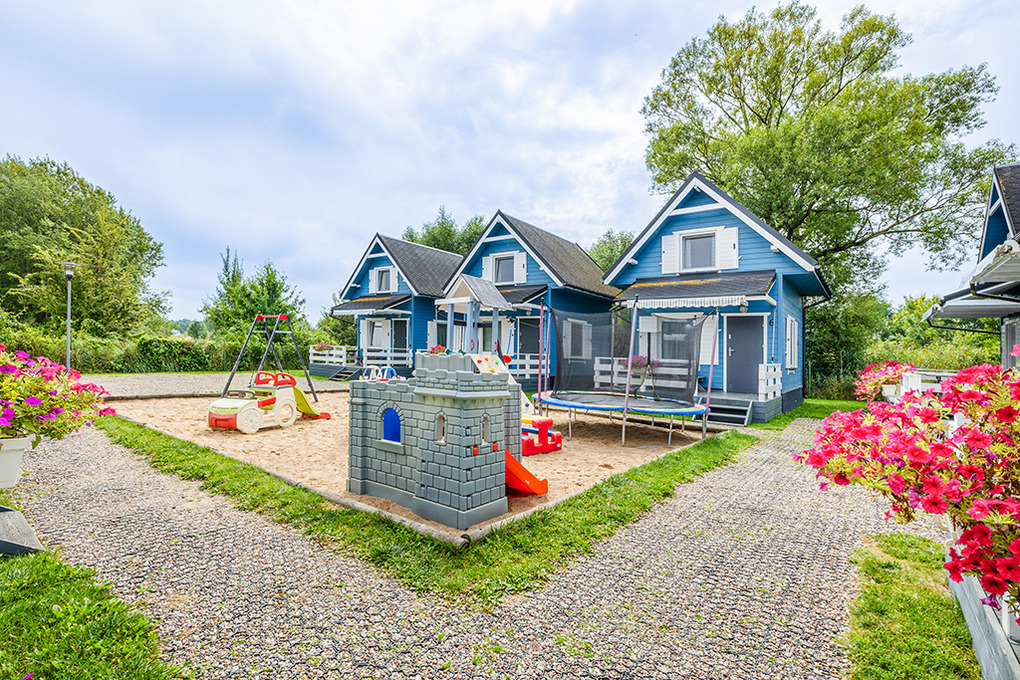 Haus: Schöne Ferienhausanlage mit 8 Holzblockhäusern. Freundliche Ferienhäuser mit funktionaler Einrichtung. Kostenloser Internetzugang (WiFi). Heizung mit E-Radiatoren, Warmwasser über E-Boiler (50 l). Terrasse mit Sitzmöbeln. In der Anlage: großer Kinderspielplatz. 1 Pkw-Stellplatz/Ferienhaus auf umzäuntem Grundstück.