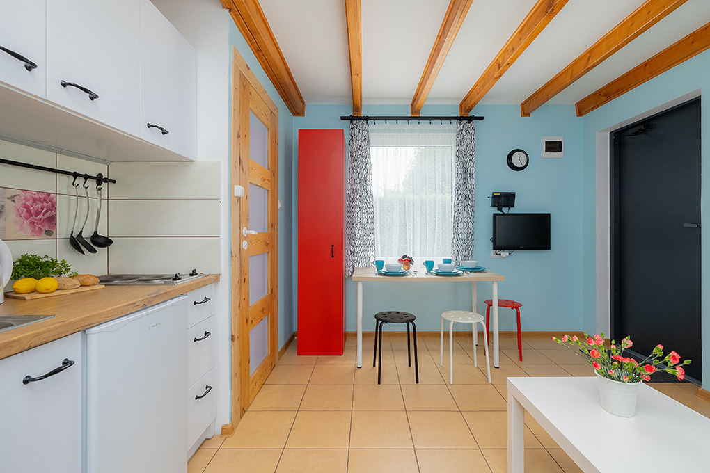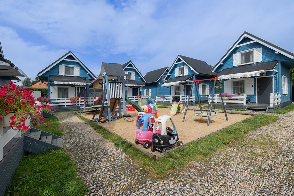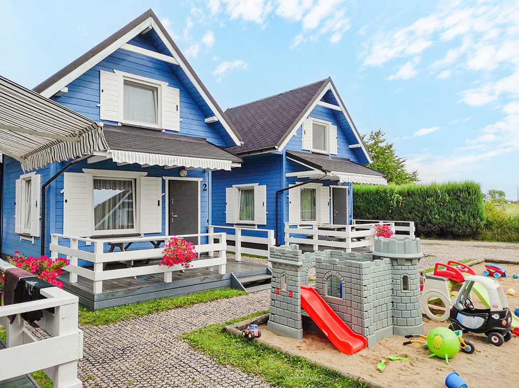 Haus: Schöne Ferienhausanlage mit 8 Holzblockhäusern. Freundliche Ferienhäuser mit funktionaler Einrichtung. Kostenloser Internetzugang (WiFi). Heizung mit E-Radiatoren, Warmwasser über E-Boiler (50 l). Terrasse mit Sitzmöbeln. In der Anlage: Kleiner Kinderspielplatz. 1 Pkw-Stellplatz/Ferienhaus auf umzäuntem Grundstück.