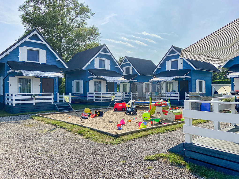 Ort: Rewal. Kleine Ferienhaussiedlung in ruhiger Lage am Ortsrand. Ostseestrand 490 m. Ortsmitte 800 m. Einkaufen, Restaurants 300 m.