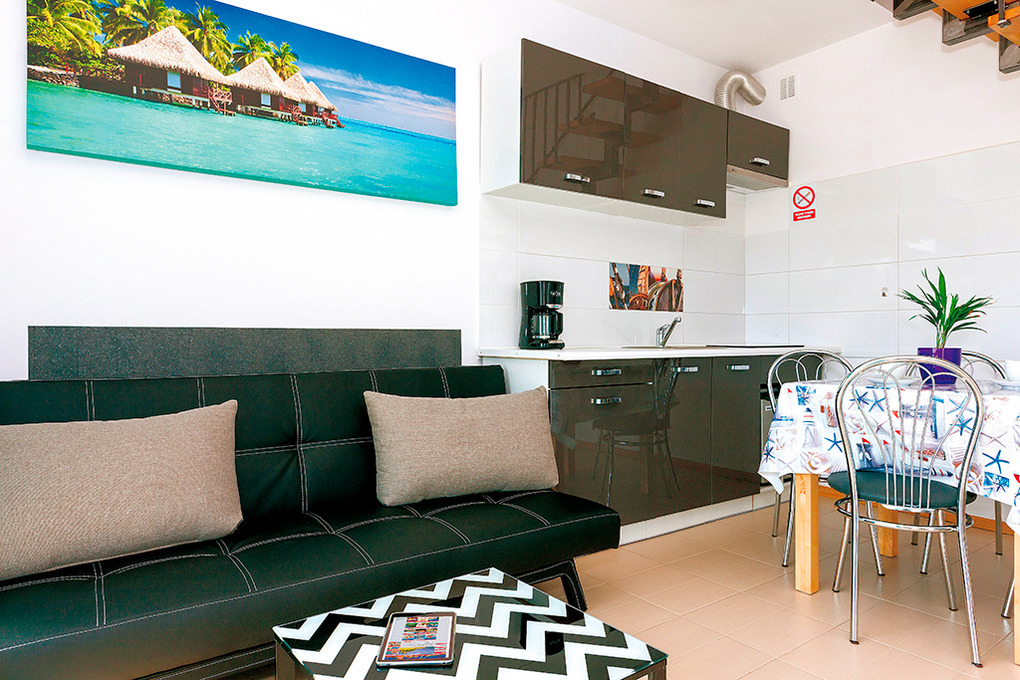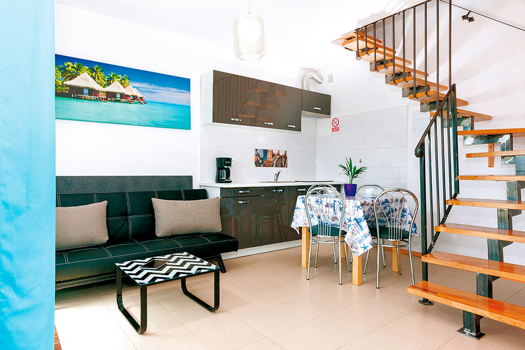 PL 55.20 Ferienhaus 2-4 Pers.: Komfortables 3-Zimmer-Reihenhaus mit ca. 50 qm Wohnfläche über 2 Etagen. Parterre: Wohn-/Essraum mit modernem Sofa, Flachbild Sat-TV mit deutschen Programmen, Esstisch, Küchenzeile (2 E-Platten). Bad/WC. 1. Etage: Doppelzimmer. 3-Bettzimmer. Hinweis: Die max. Belegung des Ferienhauses darf 4 Pers. nicht überschreiten.