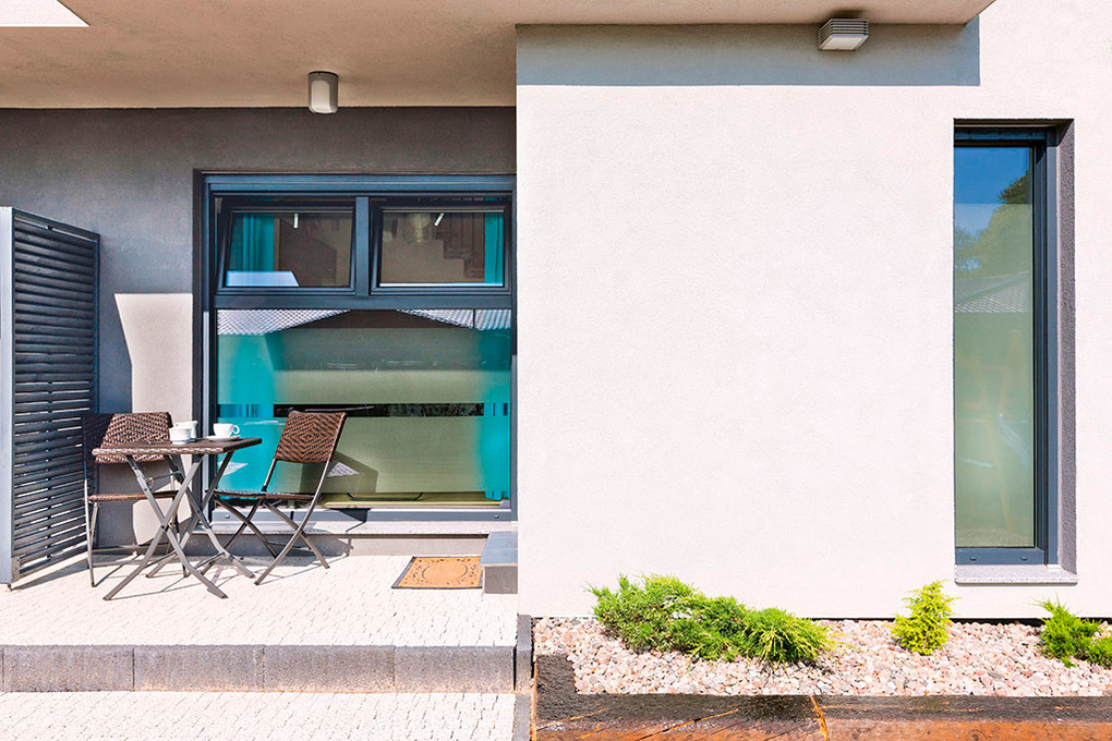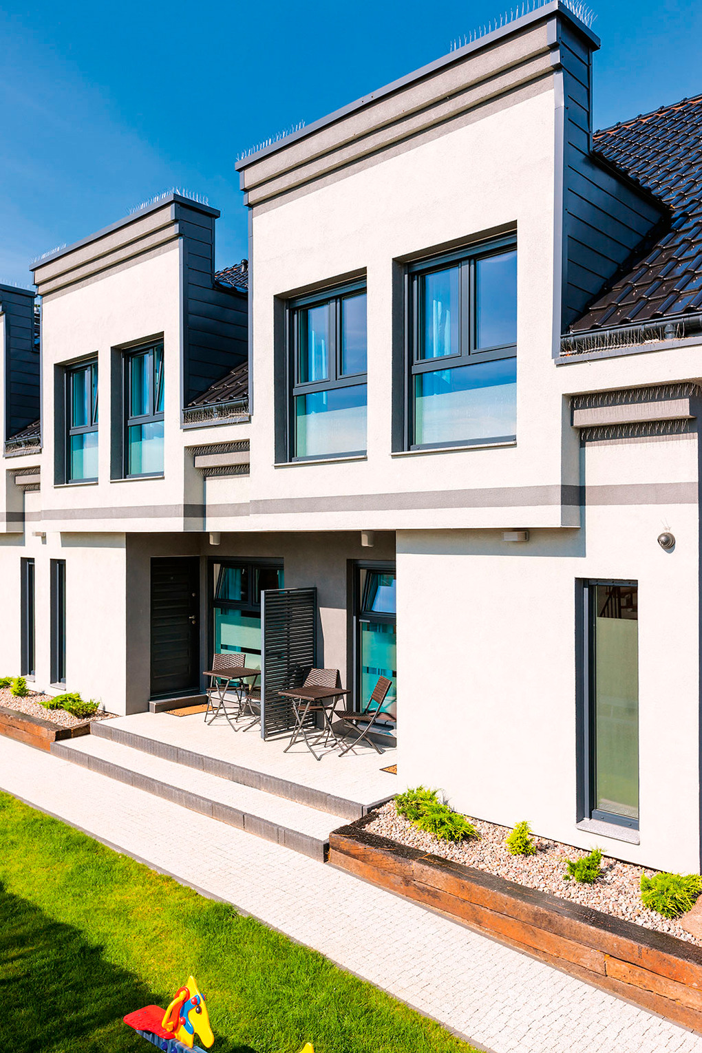 Haus: Schöne Reihenhäuser. Freundliche, wohnliche Einrichtung. Kostenloses Internet (WiFi). Zentralheizung. Terrasse mit Sitzmöbeln. Kleiner Spielplatz mit Schaukel, Rutsche, Trampoline zur gemeinschaftlichen Nutzung. 1 Pkw-Stellplatz/Haus auf dem umzäunten Grundstück.