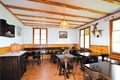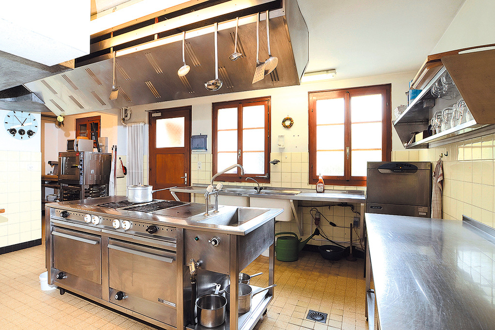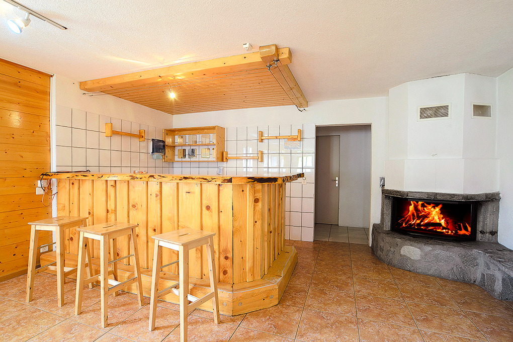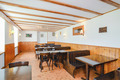 Parterre: Aufenthaltsraum mit Esstischen. Partyraum mit Kamin, Bar. Gut ausgestattete Hotelküche mit Spülmaschine, Tiefkühltruhe. Separates WC.