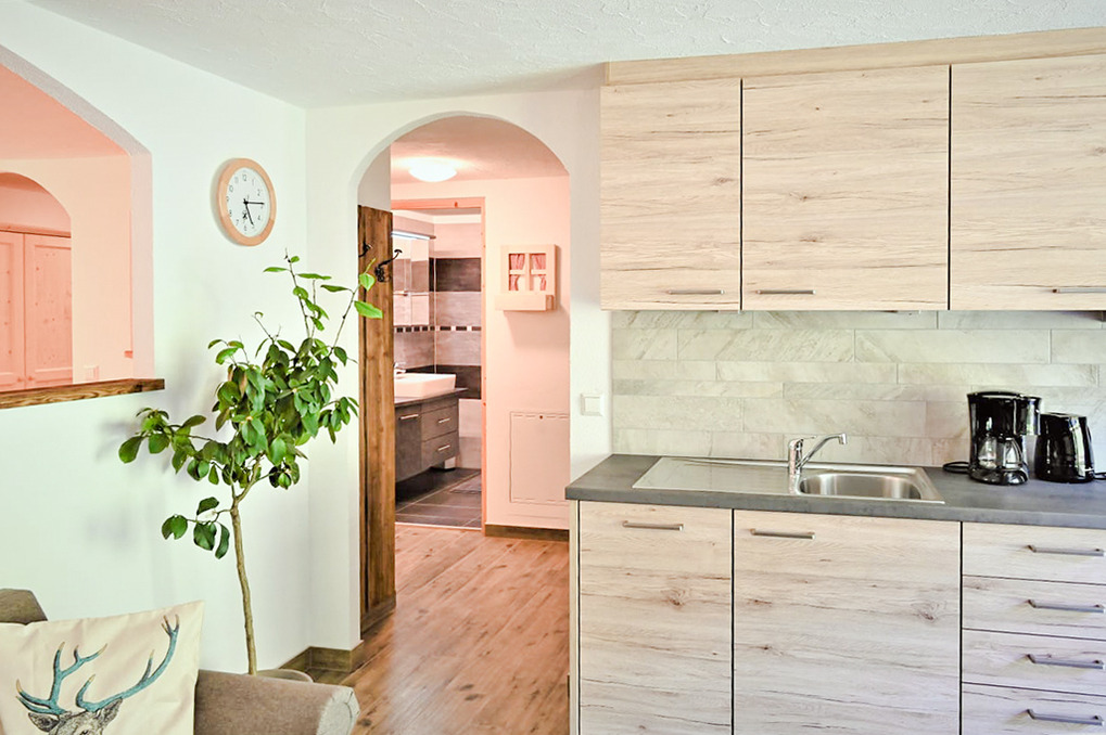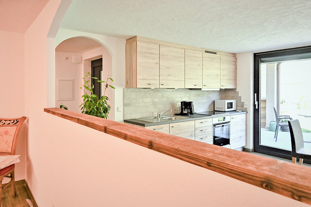 I 25.5 Wohnung 2 Pers.: 2-Zimmerwohnung, 45 qm Wohnfläche, Parterre. Freundlicher Wohn-/Essraum mit Couchgarnitur, Sat-TV, Esstisch, moderne Küchenzeile (Backofen, Spülmaschine). Doppelzimmer. Bad: Du, Wb, WC, Bidet. Ausgang in den schön gestalteten Garten.