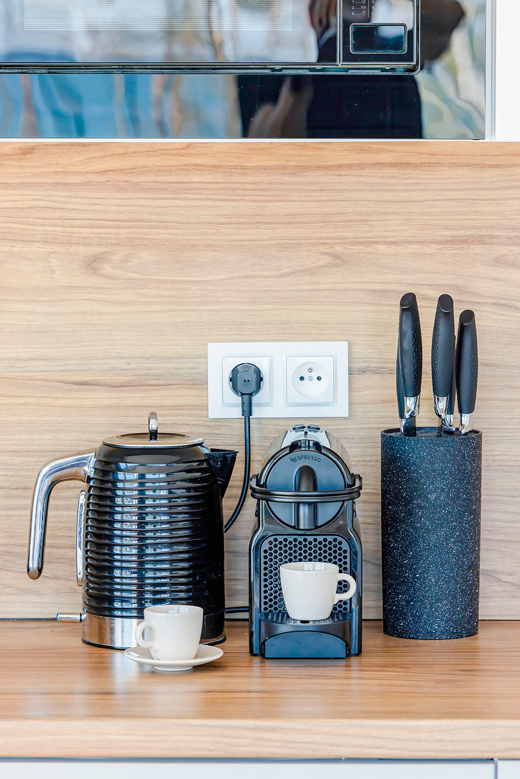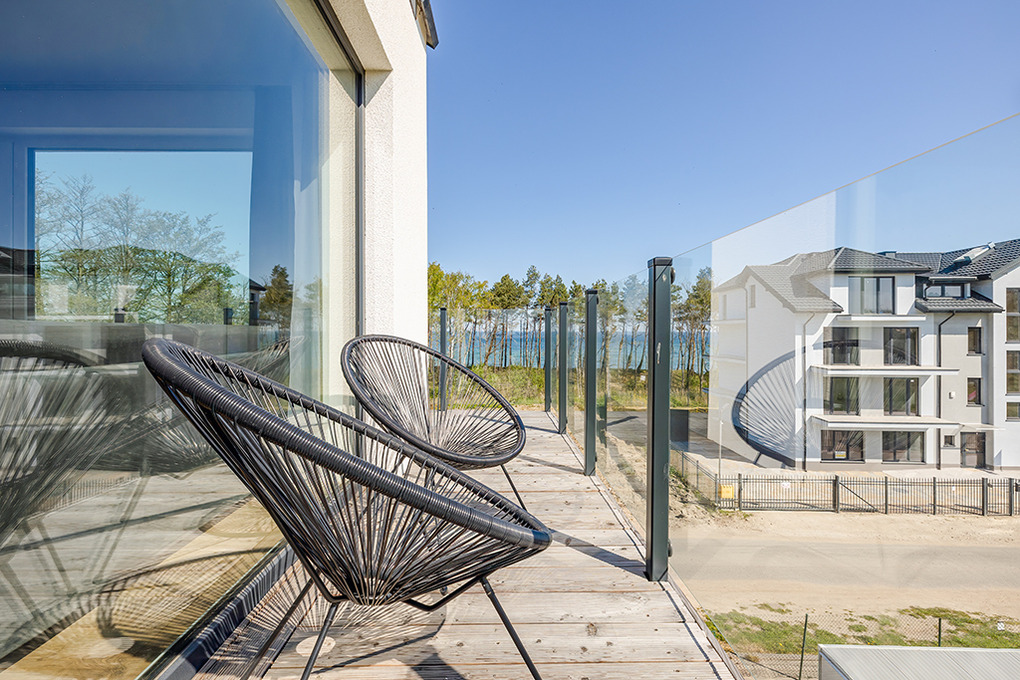 PL 55.30 Wohnung 1-4 Pers. mit direktem Wasserblick: Exklusive 2-Zimmerwohnung mit 42 qm Wohnfläche, 1. oder 2. Etage. Schöner Wohn-/Essraum mit Sofa (Ausziehcouch 2 Pers.), Sat-TV (deutsche Programme), rundem Esstisch, moderner, gut ausgestatteter Küchenzeile (Induktionsherd 2 Platten, Mikrowelle, Kaffee-Espresso-Maschine, Spülmaschine). Schönes Doppelzimmer. Modernes Bad mit ebenerdiger, durch Glaswand abgetrennter Regenwald-Dusche, Wb, WC. Highlight ist der schöne Balkon mit Sitzmöbeln und herrlichem, direktem Wasserblick.