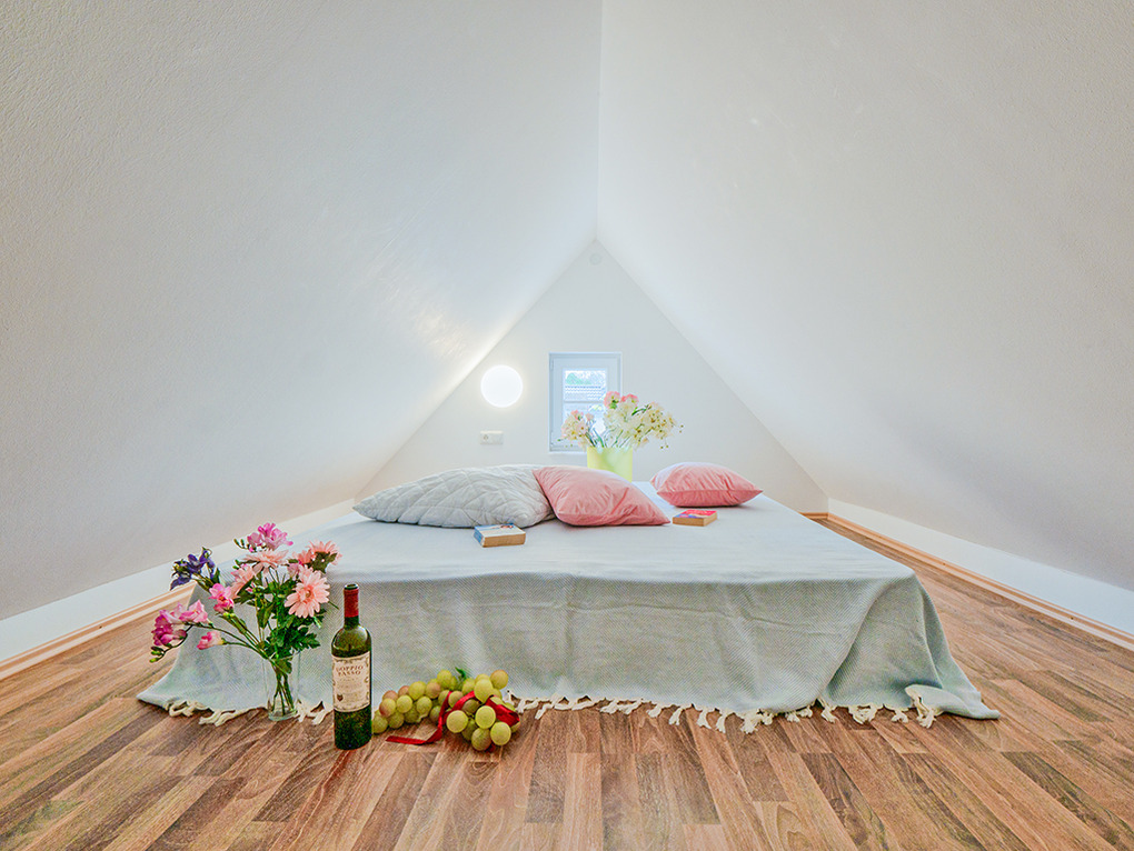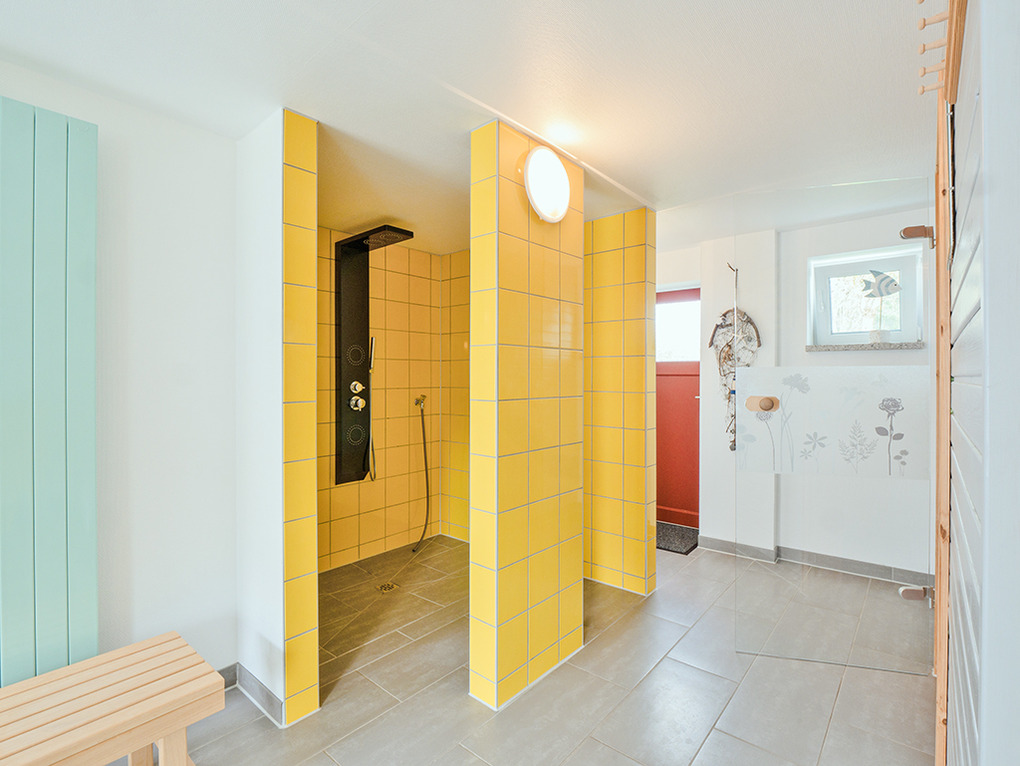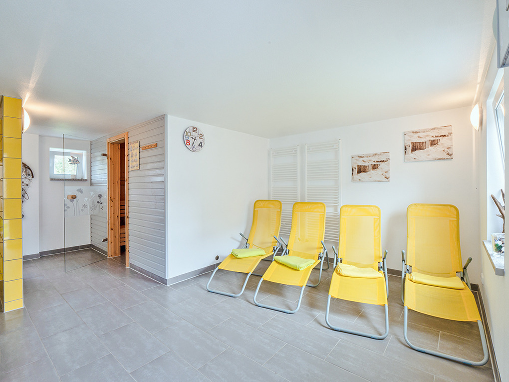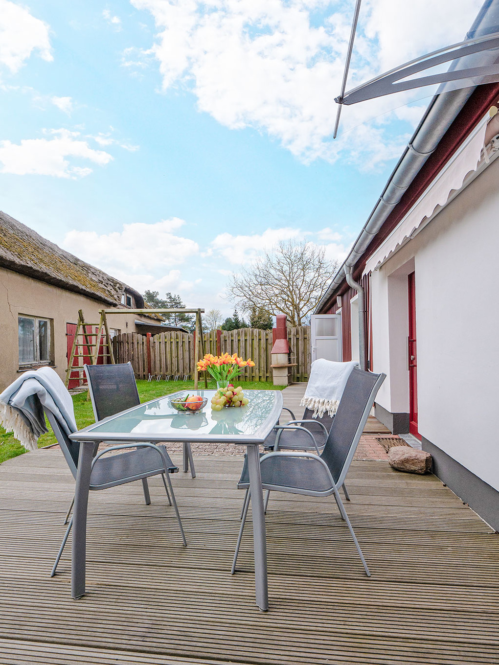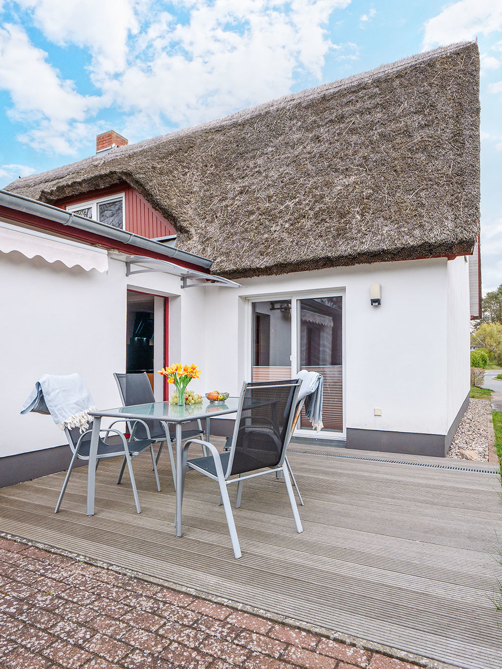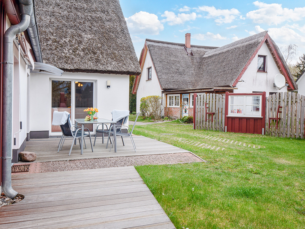 Haus: Schönes, renoviertes Doppelhaus mit Rohrdach und Außensauna. Haushälfte mit moderner, geschmackvoller Möblierung. Zentralheizung. Im Anbau des Hauses: Saunabereich mit Ruheliegen, Dusche, WC zur gemeinschaftlichen Nutzung. Gepflegter Garten mit Rasenfläche, Schaukel, Grill. 2 Pkw-Stellplätze.