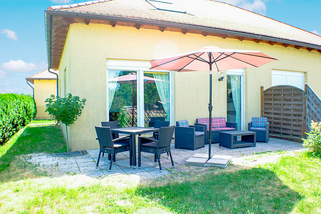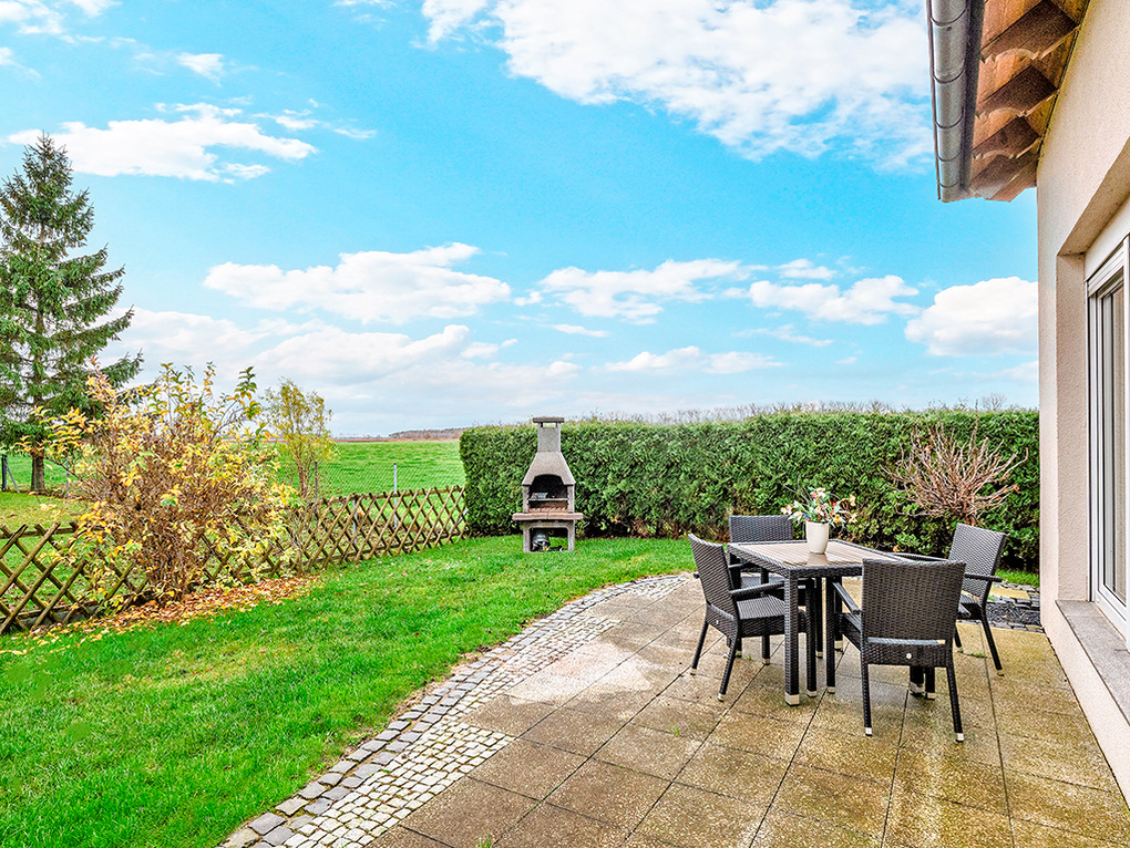 Haus: Schönes, neues Ferienhaus mit 2 Ferienwohnungen auf abgeschlossenem Gartengrundstück. Außerordentlich gute Einrichtung. E-Fußbodenheizung. Internetzugang über W-Lan. Terrasse (25 qm) mit Sitzmöbeln, weitem Ausblick. Mit ihrem schönen Garten bietet die Fewo Ferienhaus-Ambiente.